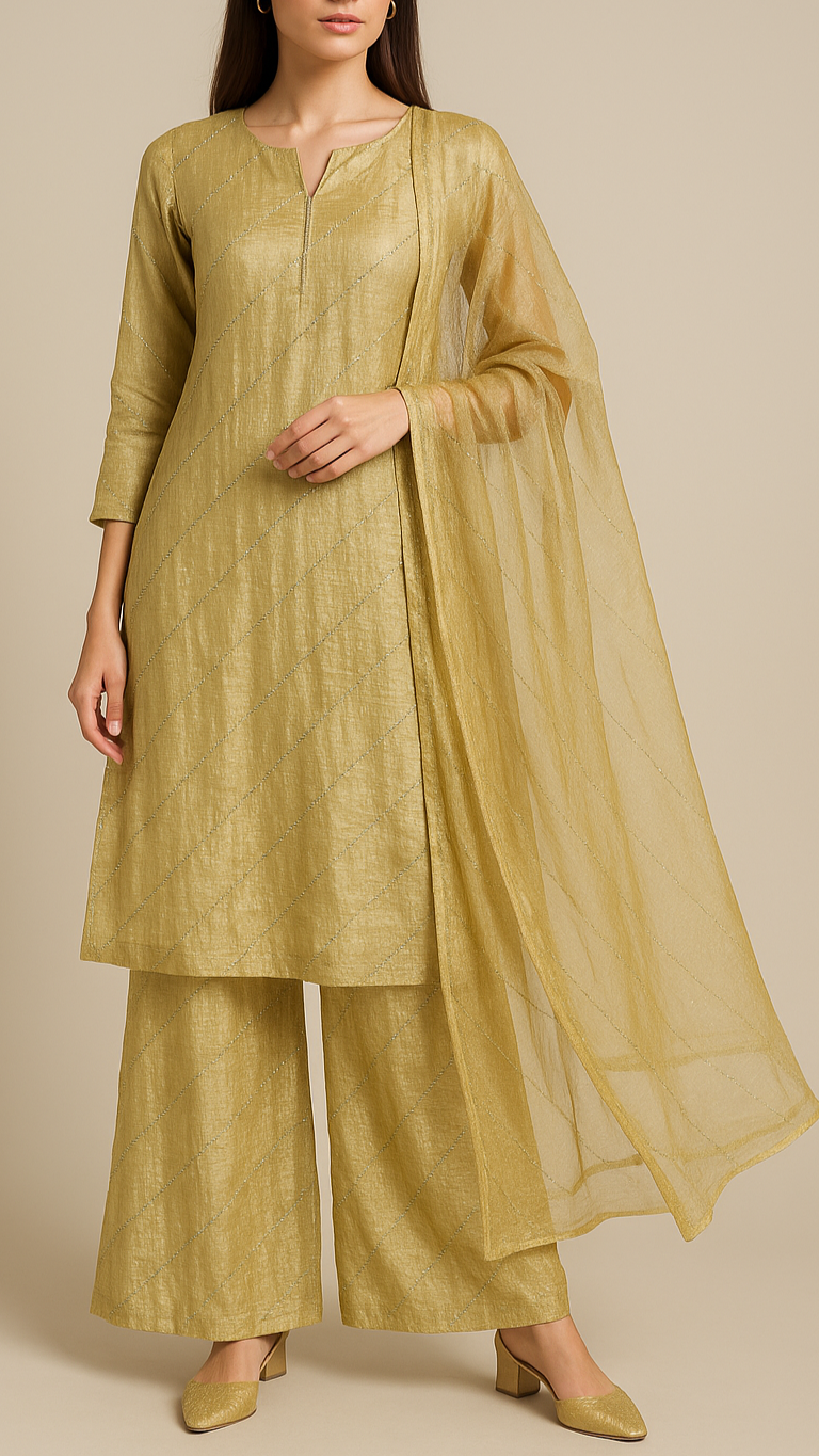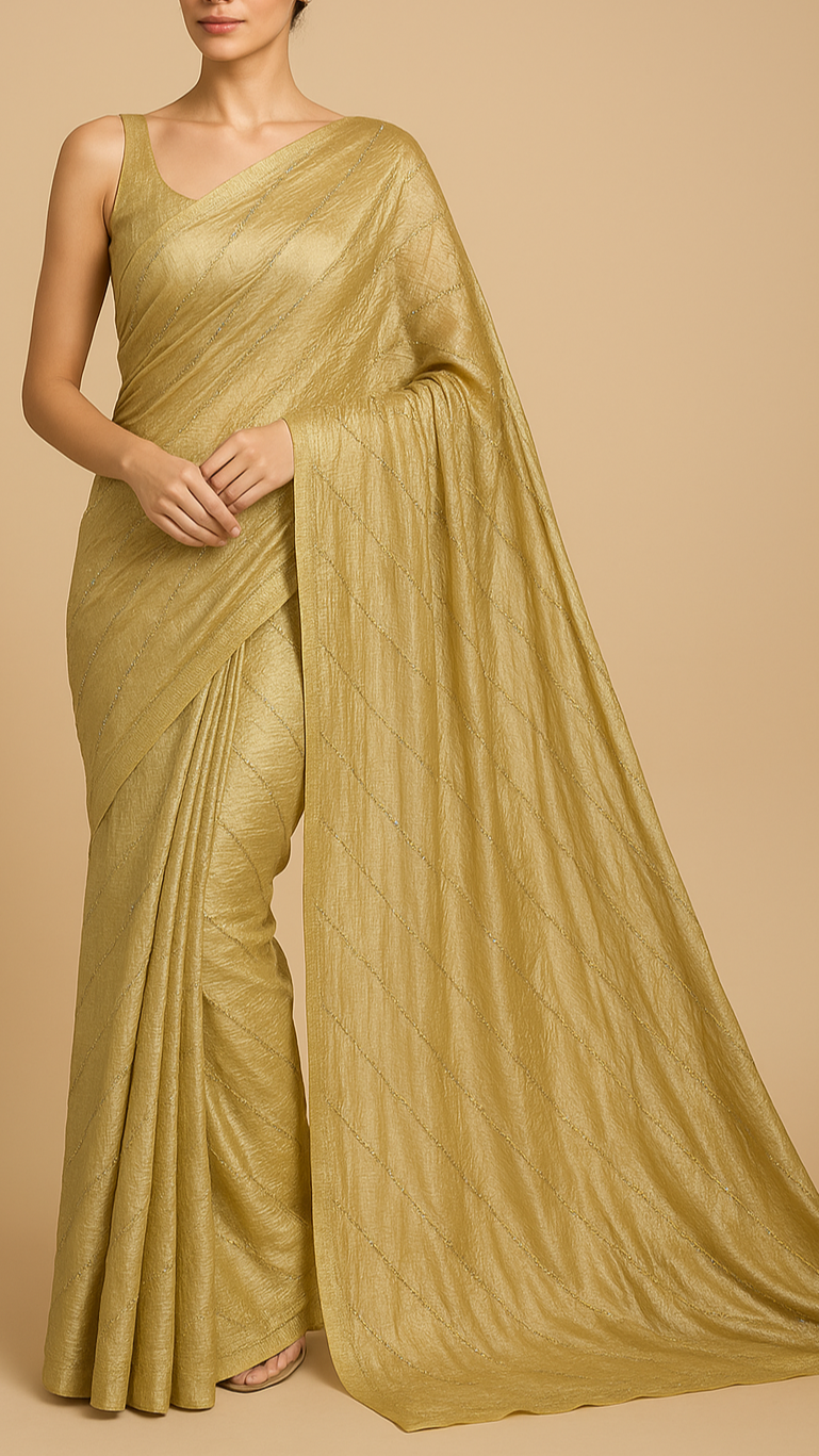 | Fabric Name | Golden Crushed Tissue Fabric With All Over Diagonal Stripes Of Katdana, Bead And Sequins Work |