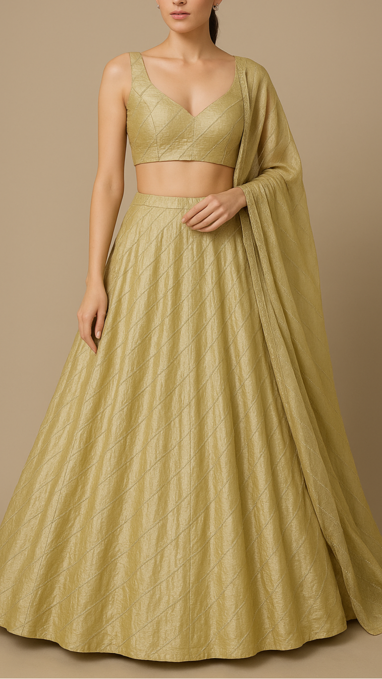 Ideal for lehengas, gowns, sarees, and dupattas, this fabric adds opulence to both traditional and contemporary silhouettes. The diagonal embellished stripes and golden sheen make it perfect for weddings, receptions, and festive occasions, ensuring timeless glamour in every ensemble.