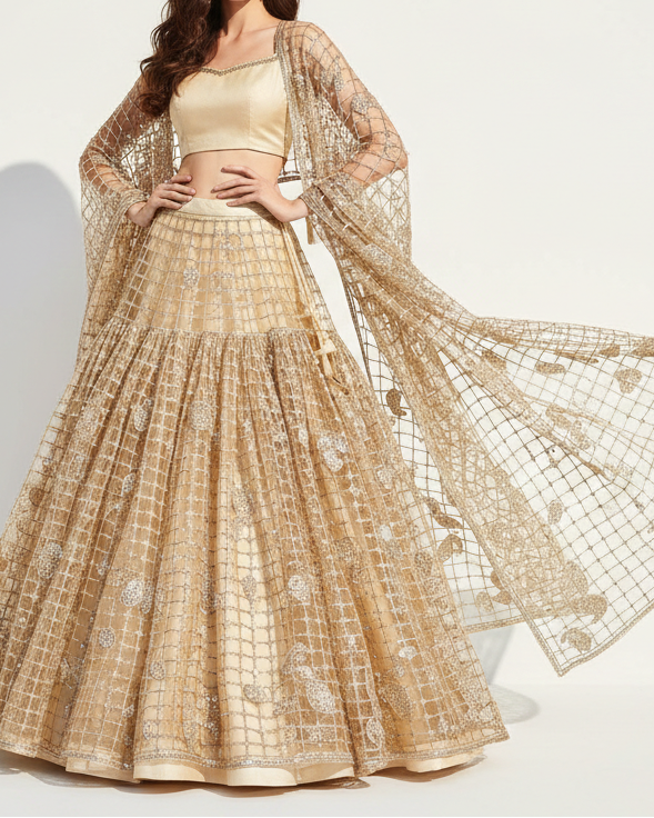 | Fabric Name | Golden Imported Net Laser CutWork Net Fabric With All Over Rose Gold Zari And Sequins |