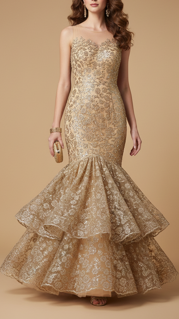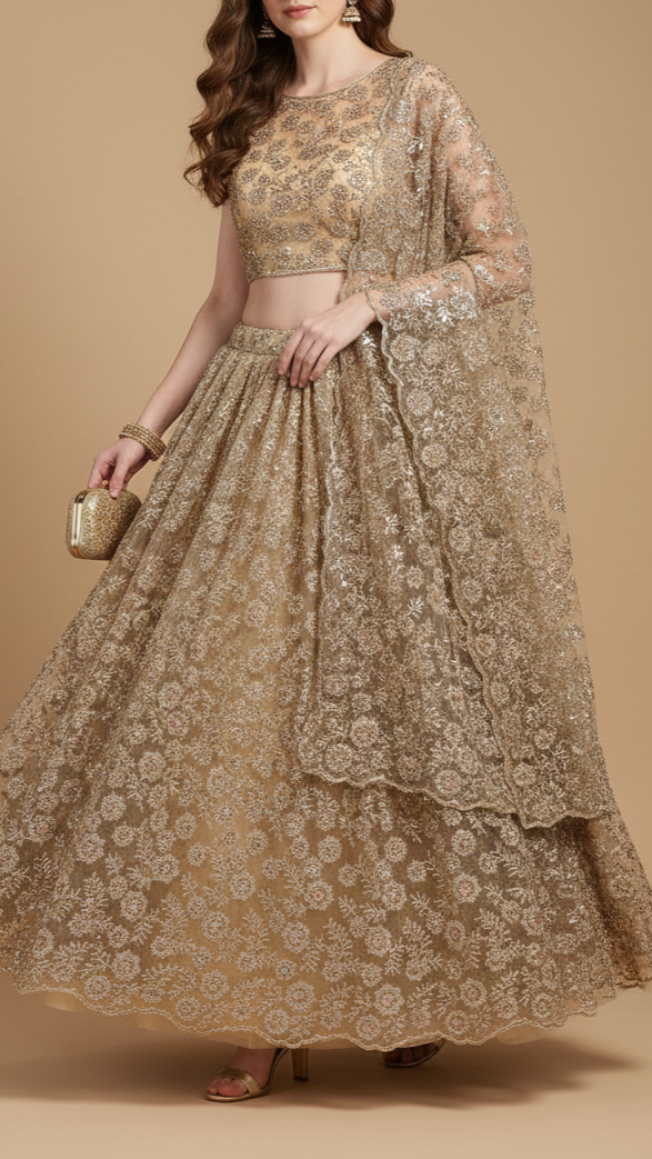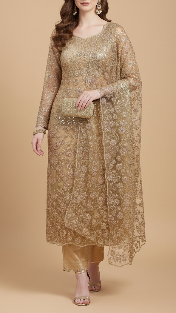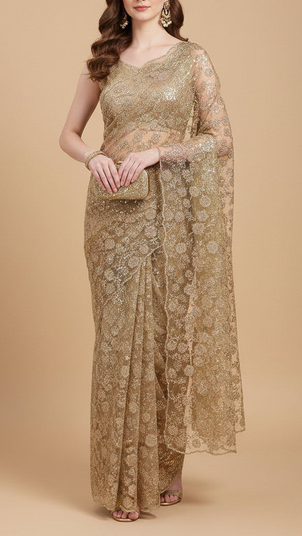 | Fabric Name | Golden Imported Net Fabric With All Over Bead, Sequins And Thread Work With Two Side Scalloped Edges |