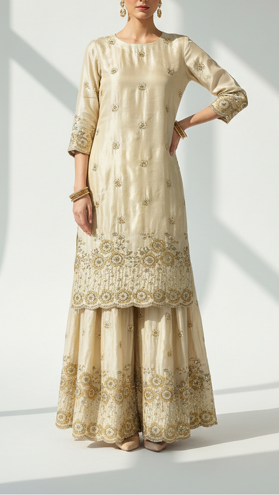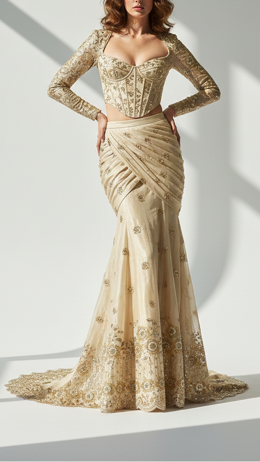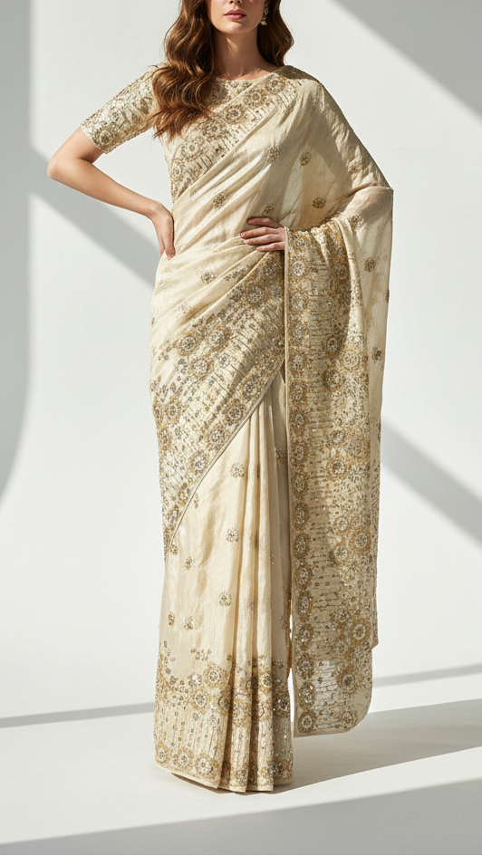 | Fabric Name | Golden Dyeable Tissue Fabric With All Over Katdana, Zari, Sequins And Bead Work With One Side Border |