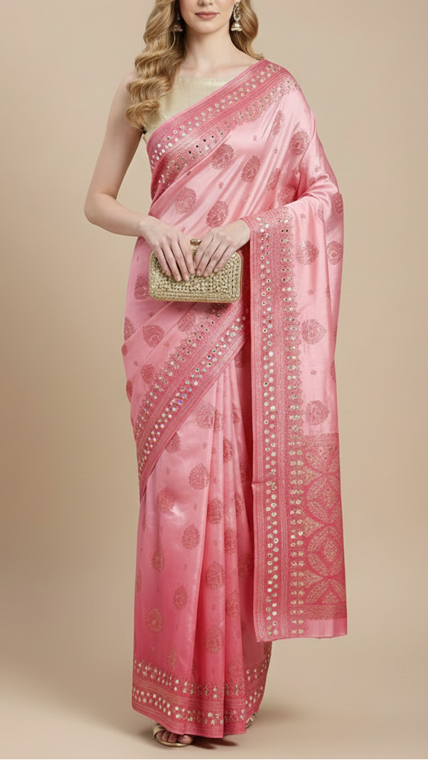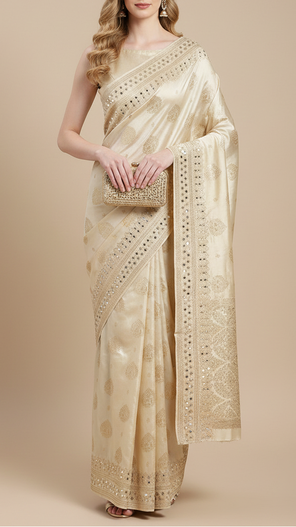 | Fabric Name | Golden Tissue Fabric With All Over Zari Handloom And One Side Border Of Zari, Mirror And Sequins Work |