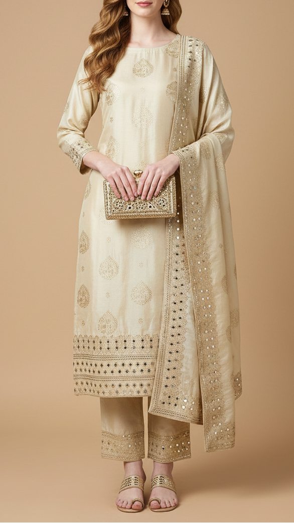 Perfect to pair with silk, georgette, or brocade suits, lehengas, and anarkalis. The intricate zari and gota patti detailing make it ideal for weddings, festive occasions, and traditional celebrations, offering a royal, radiant, and timeless appeal.