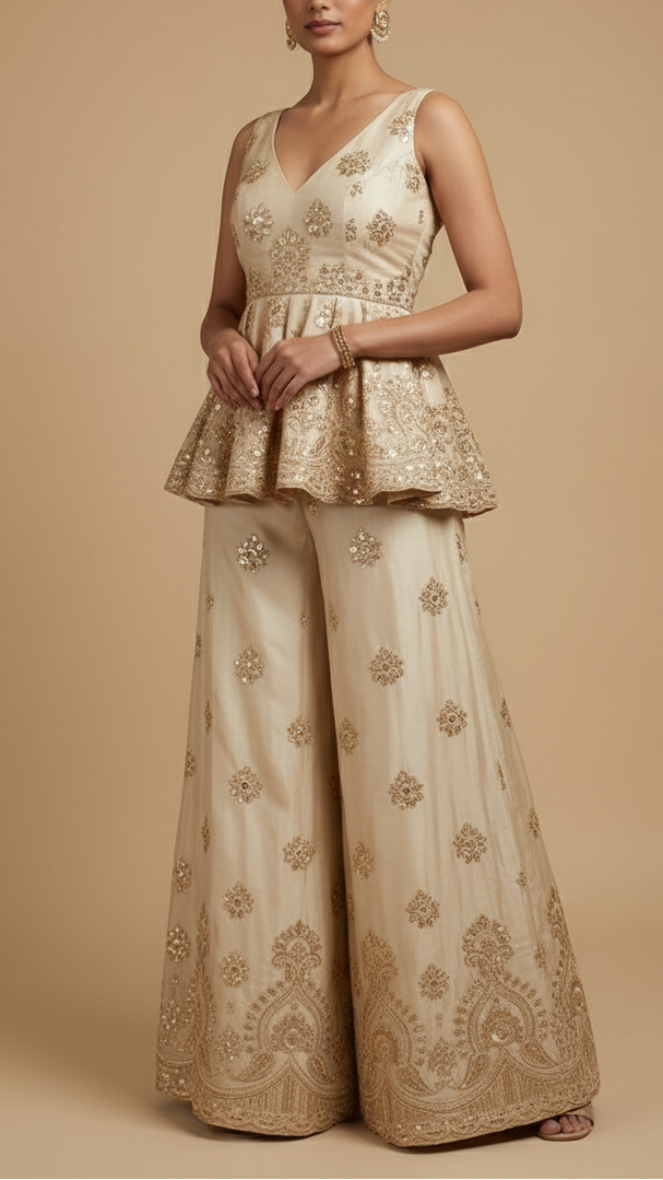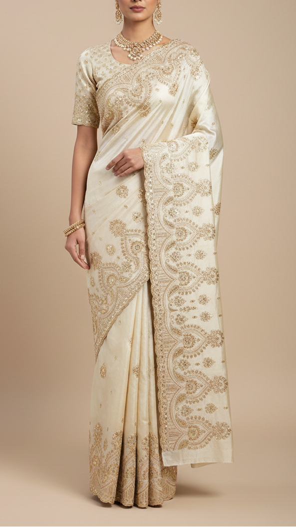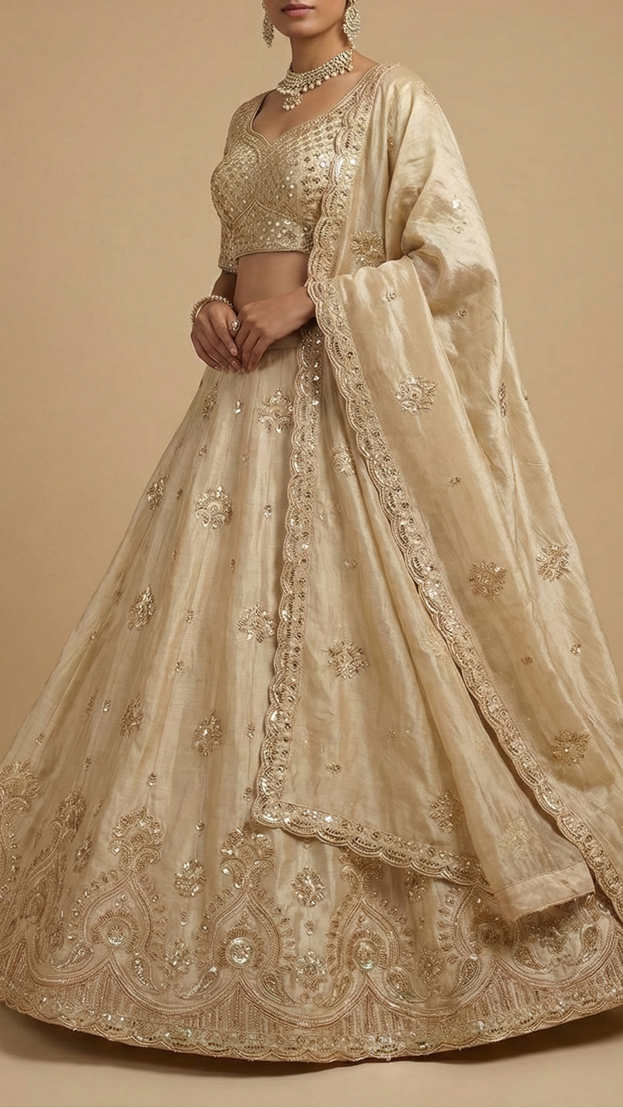 | Fabric Name | Golden Tissue Fabric With All Over Zari Sequins And Faux Mirror Work |