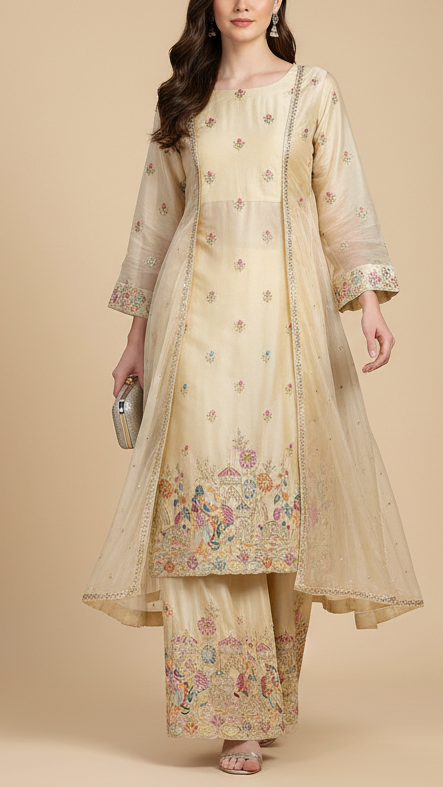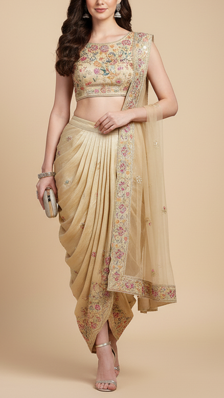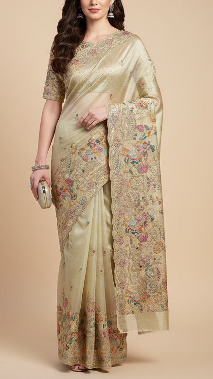 | Fabric Name | Golden Tissue Fabric With All Over Zari, Sequins And Thread Work With One Side Border |