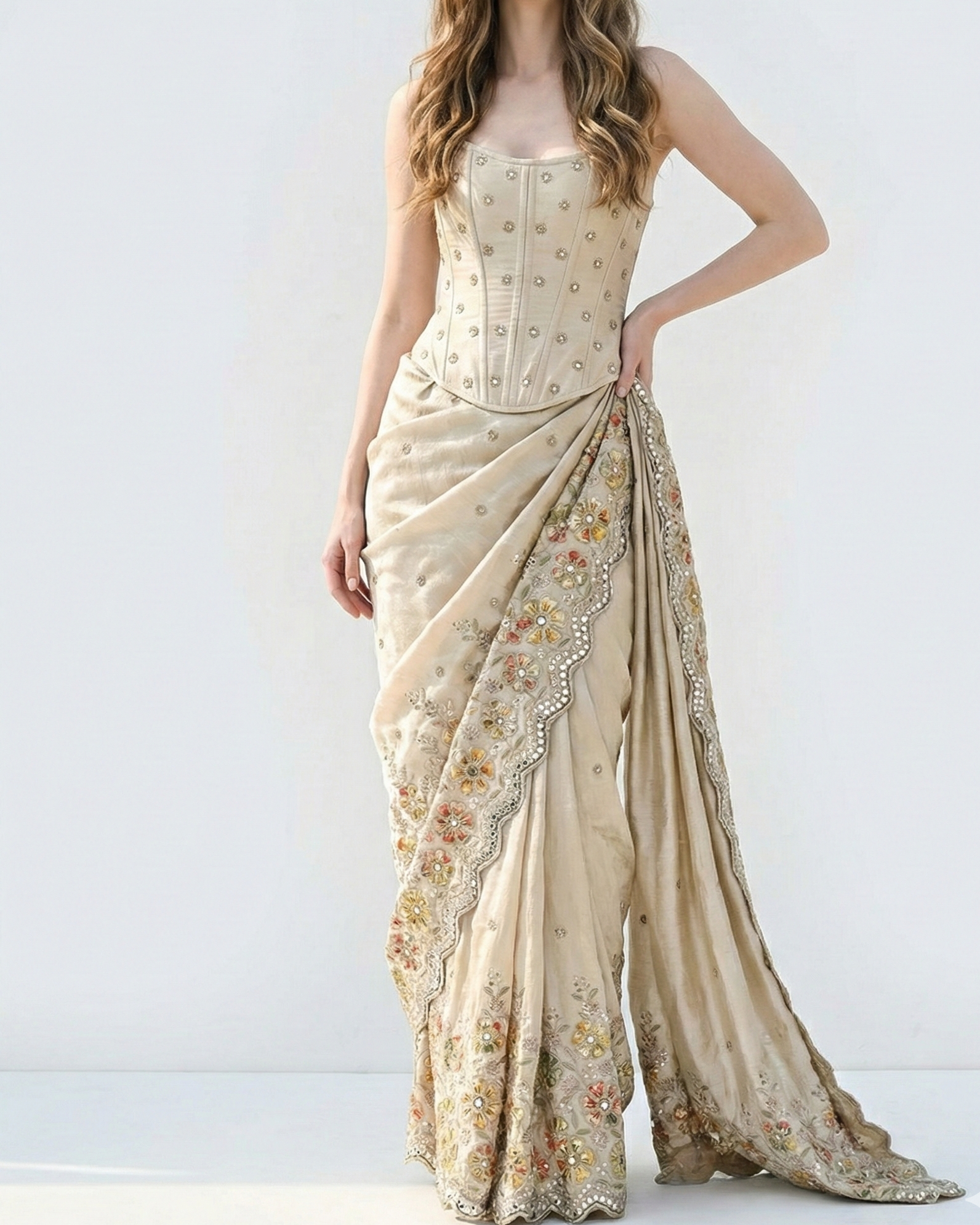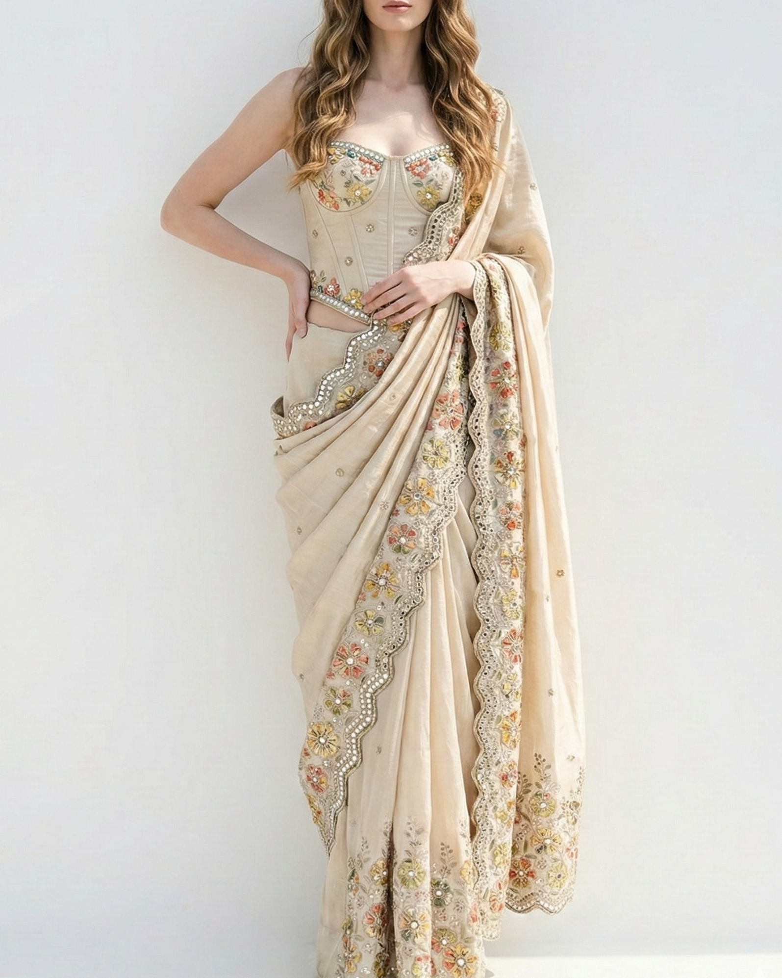 Golden Dyeable Tissue Fabric With All Over Zari, Sequins, Faux Mirror And Bead Work With One Side Patch Work And Scalloped Border 21379