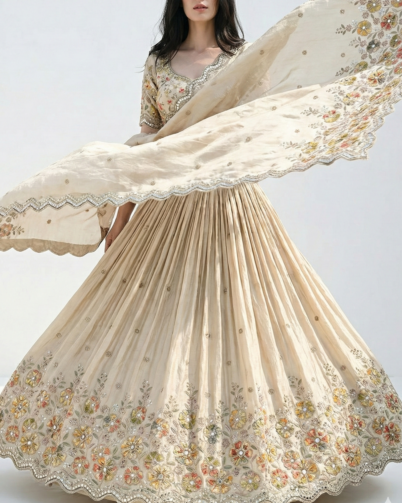 | Fabric Name | Golden Dyeable Tissue Fabric With All Over Zari, Sequins, Faux Mirror And Bead Work With One Side Patchwork And Scalloped Border |