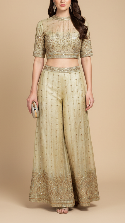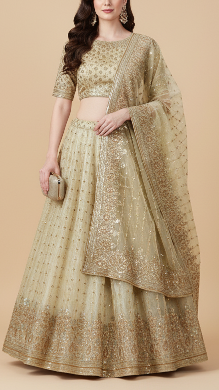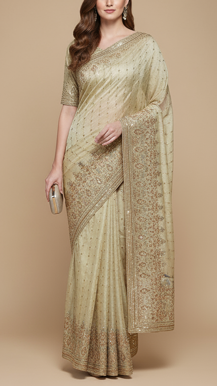 | Fabric Name | Golden Tissue Fabric With All Over Zari, Sequins, Katdana And Bead Work With One Side Border |