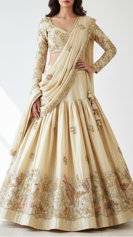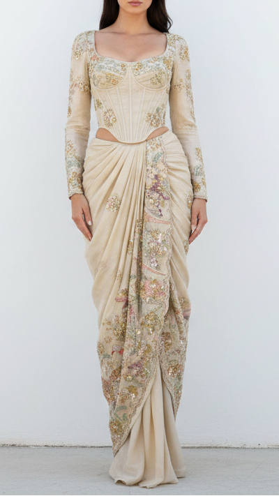 | Fabric Name | Golden Tissue Fabric With Allover Bead, Katdana, Zari, Thread And Sequins Work With One Side Border |