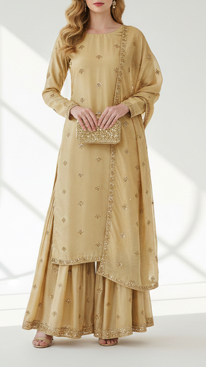 | Fabric Name | Tissue Fabric with Allover Buti of Sequins, Katdana and Bead Work |