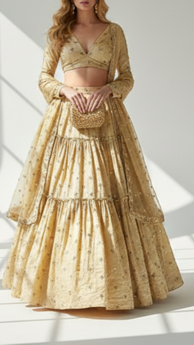 Golden Tissue Fabric with Allover Buti of Sequins, Katdana and Bead Work 20984
