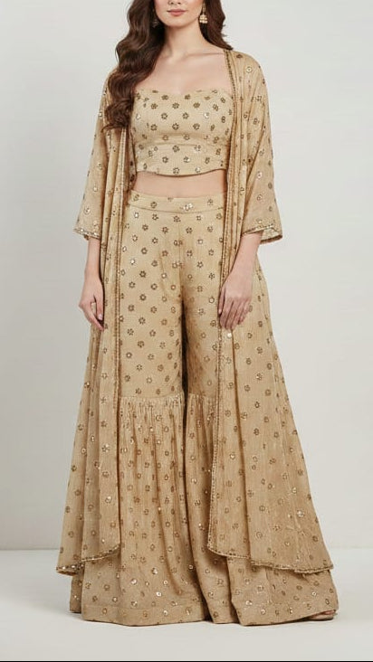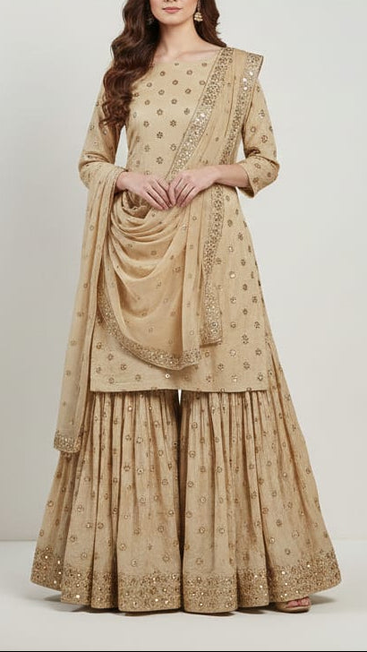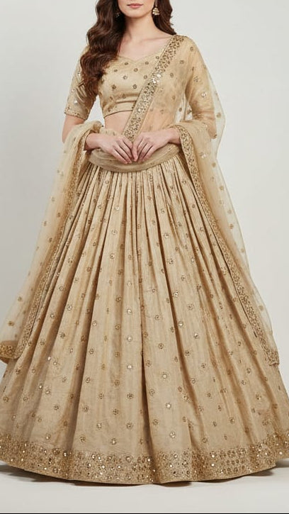 | Fabric Name | Golden Tissue Fabric with Allover Buti of Zari, Faux Mirror and Sequins Work |
