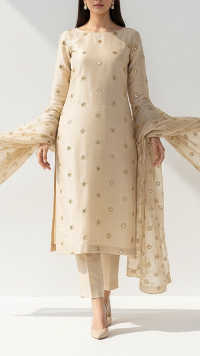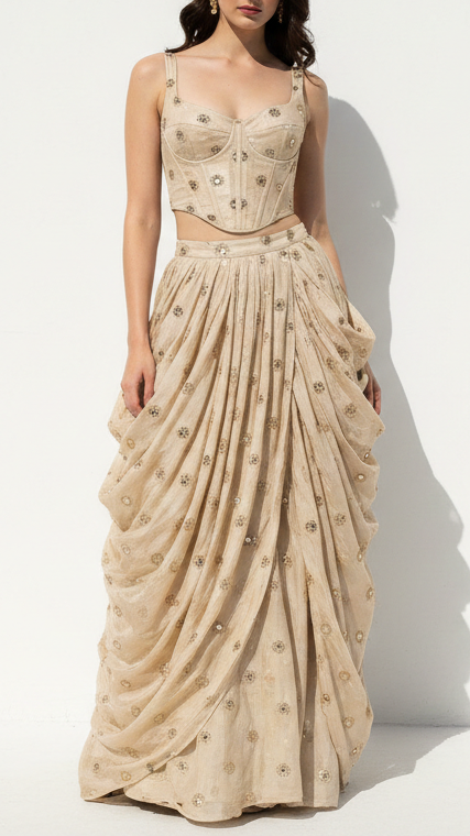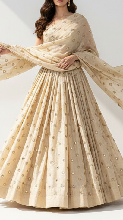 | Fabric Name | Golden Dyeable Tissue Fabric with Allover Buti of Zari, Faux Mirror and Sequins Work |