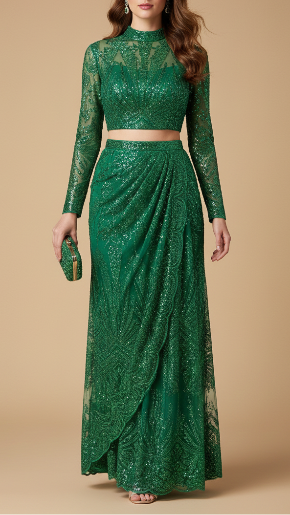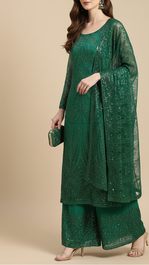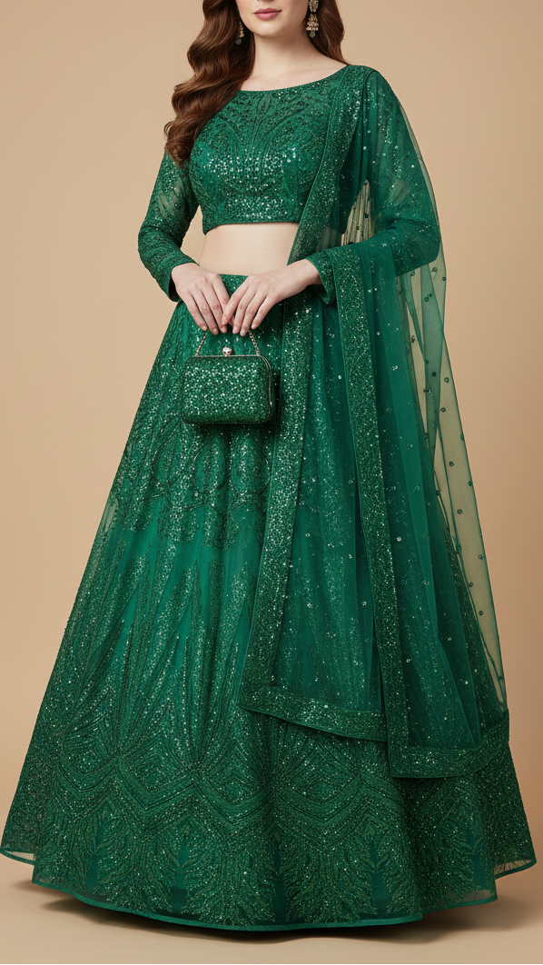 | Fabric Name | Green Georgette Fabric With All Over Sequins And Bead Work With One Side Heavy Border |