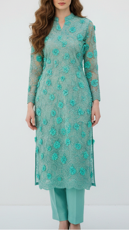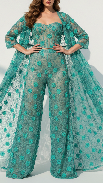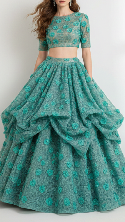 | Fabric Name | Green Net Adorned with Beads, 3rd flower , and Threadwork |