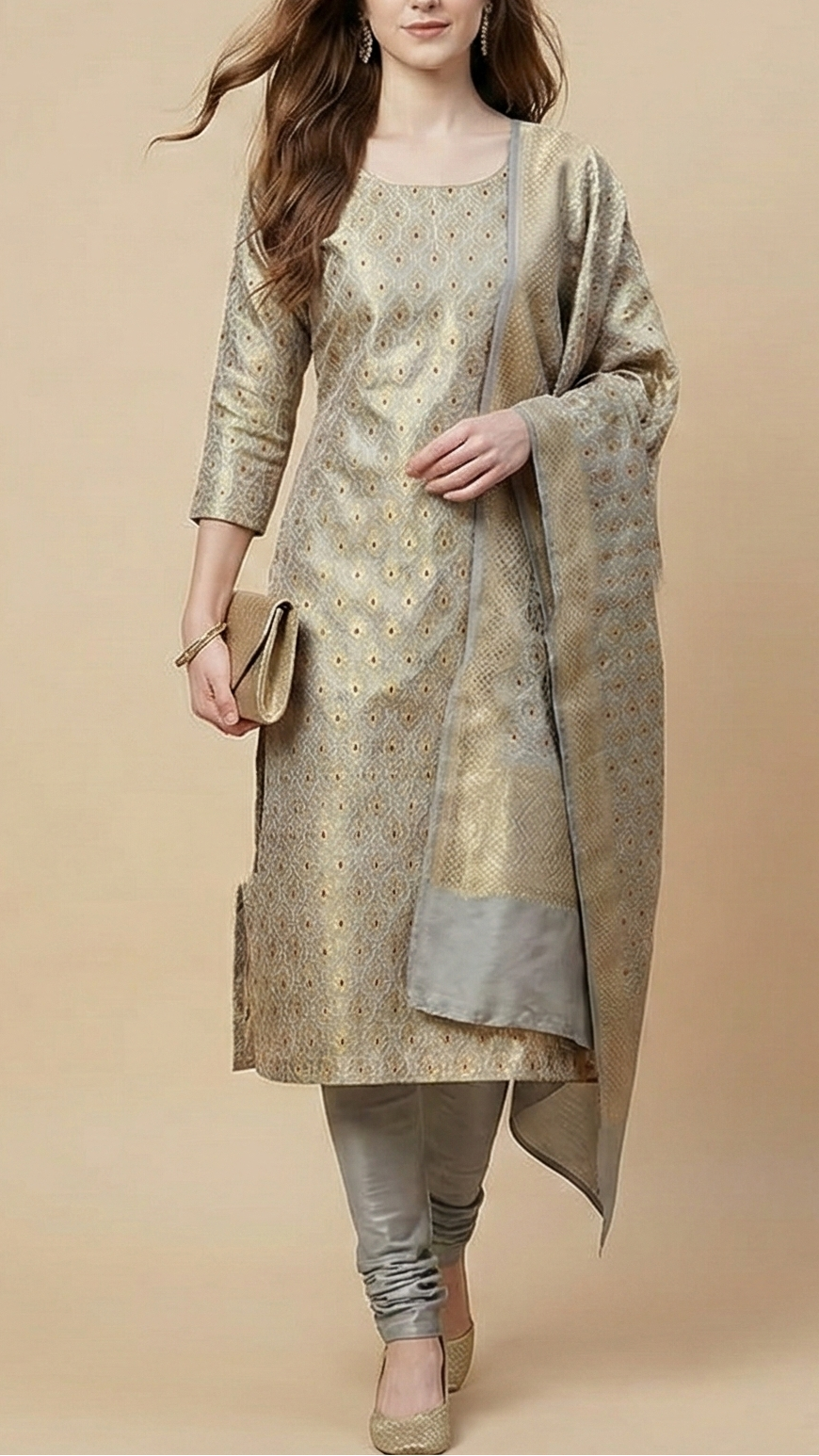 | Fabric Name | Grey Pure Banarasi Brocade Fabric with Allover Golden Zari Handloom |