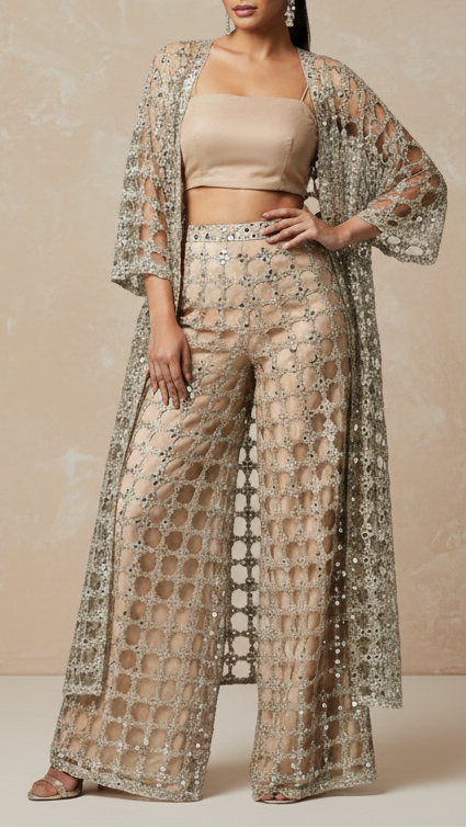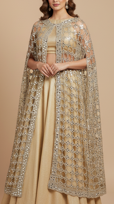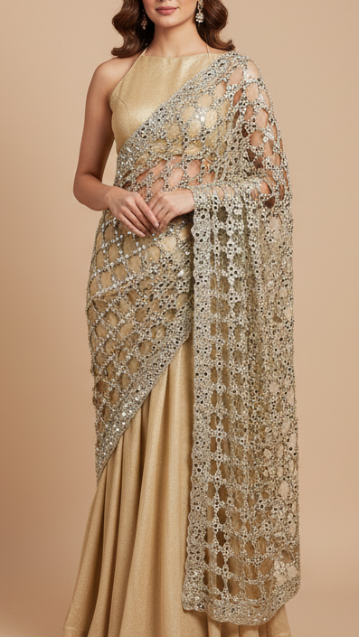 | Fabric Name | Imported Laser Cutwork Net Fabric With All Over Metallic Gold Zari And Faux Mirror Work |