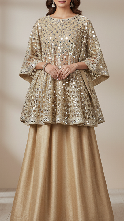 Ideal for sarees, lehengas, gowns, and dupattas, this fabric combines contemporary artistry with traditional elegance. The metallic gold zari and mirror detailing make it perfect for weddings, receptions, and grand festive occasions.
