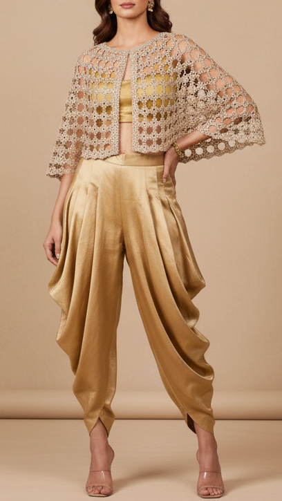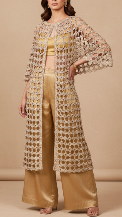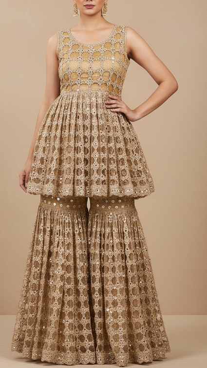 | Fabric Name | Imported Laser Cutwork Net Fabric With All Over Rose Gold Zari And Faux Mirror Work |