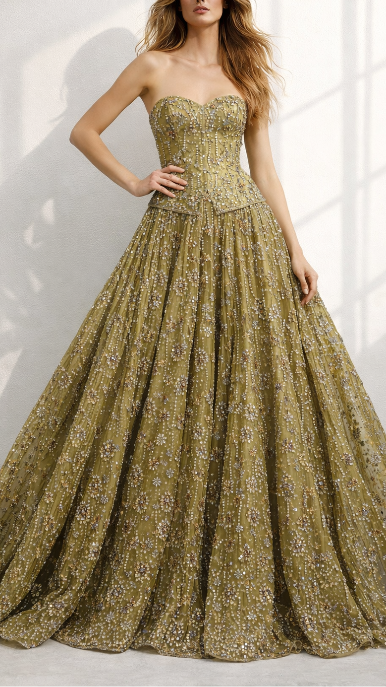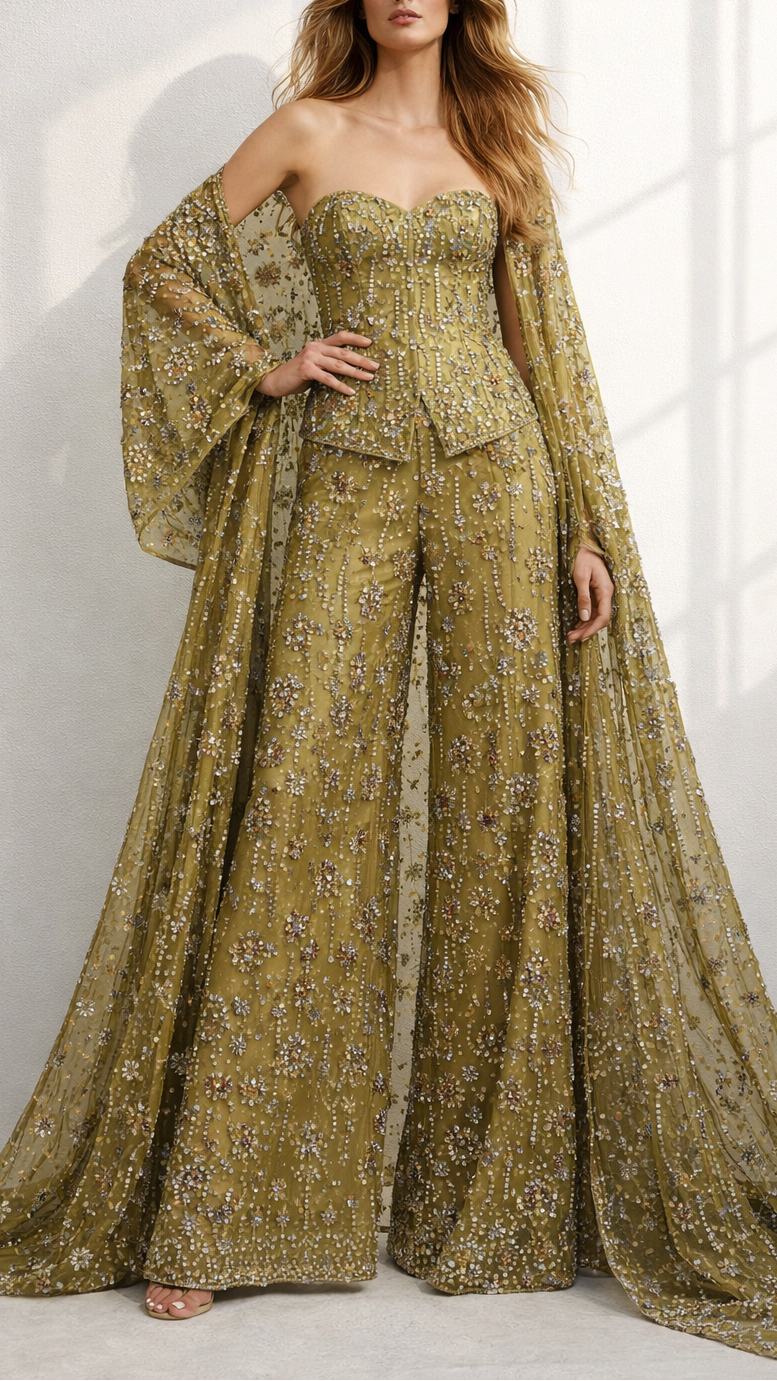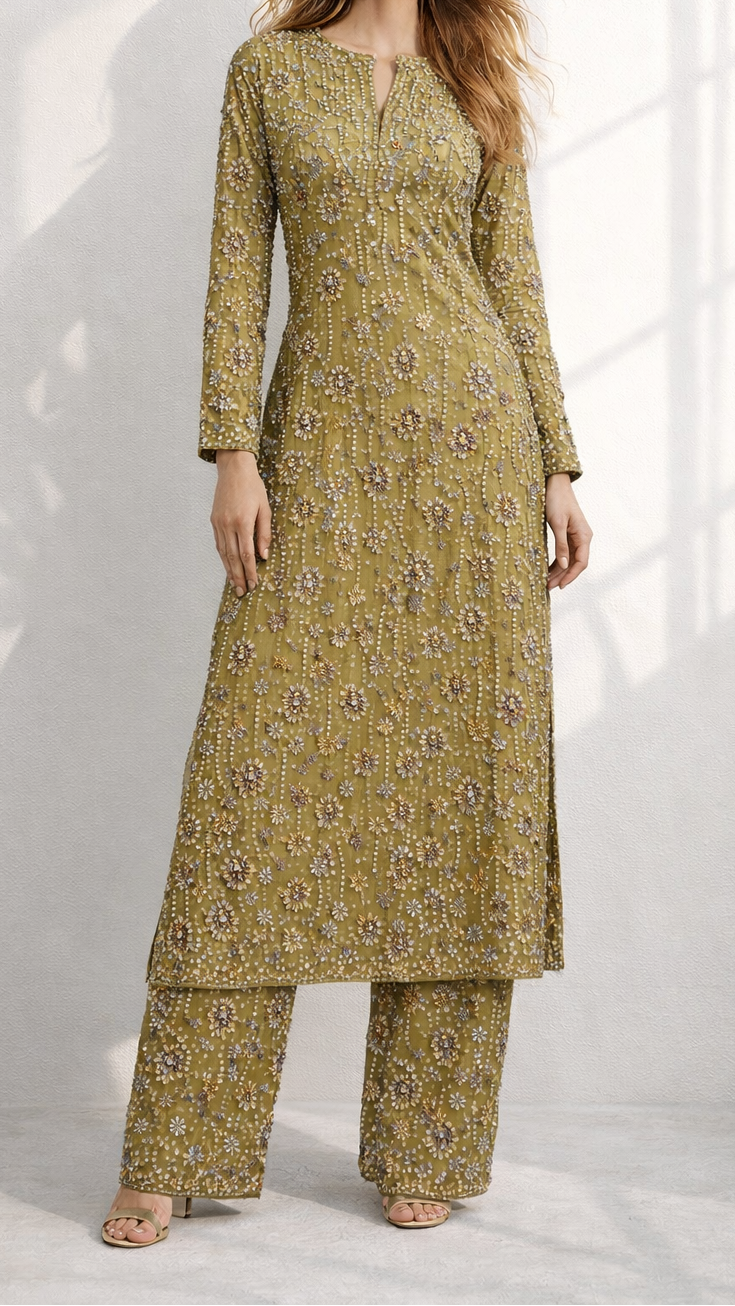 | Fabric Name | Imported Mehandi Net Fabric with Allover Sequins, Beads & Kutdana Work |