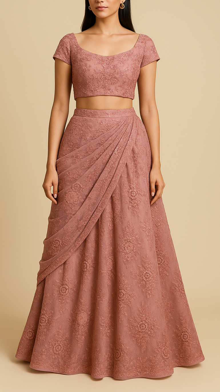 Fabric Name | Light Pink Imported Net Floral Patchwork Elegance with Scalloped Border, Sequins, Beads, and Threadwork |