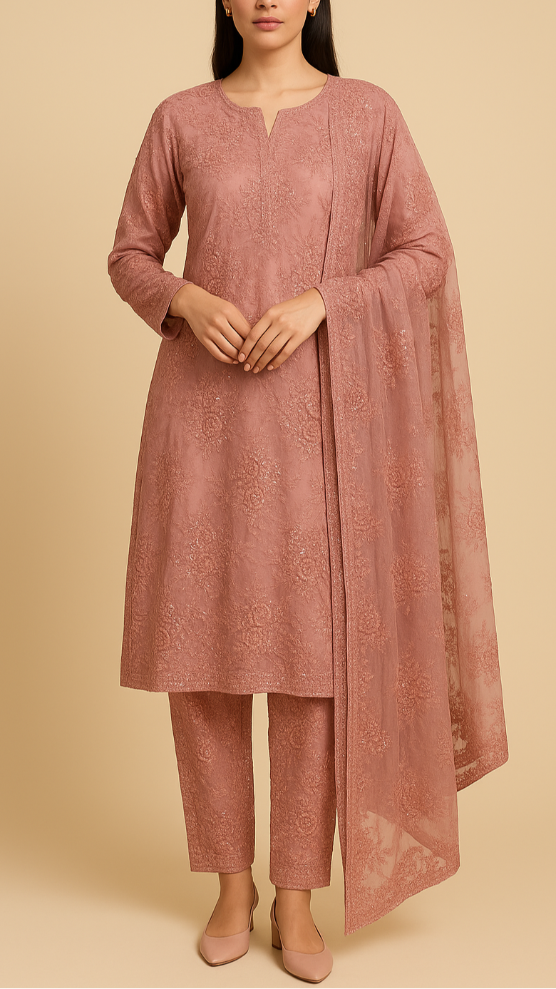 Light Pink Imported Net Floral Patchwork Elegance with Scalloped Border, Sequins, Beads, and Threadwork