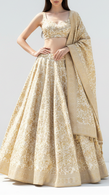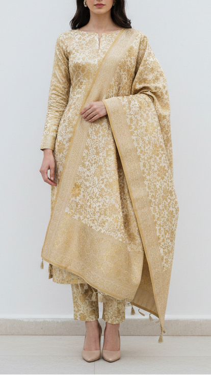 | Fabric Name | Ivory Banarasi Brocade Fabric With All Over Golden Zari Handloom |