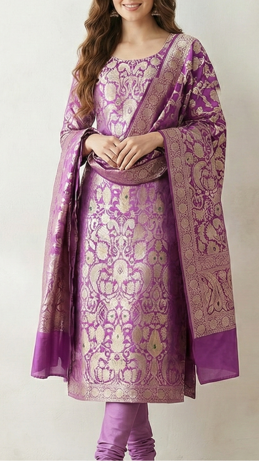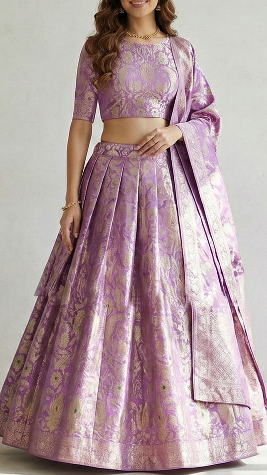| Fabric Name | Lavender Pure Banarasi Brocade Fabric With All Over Thread And Zari Handloom |