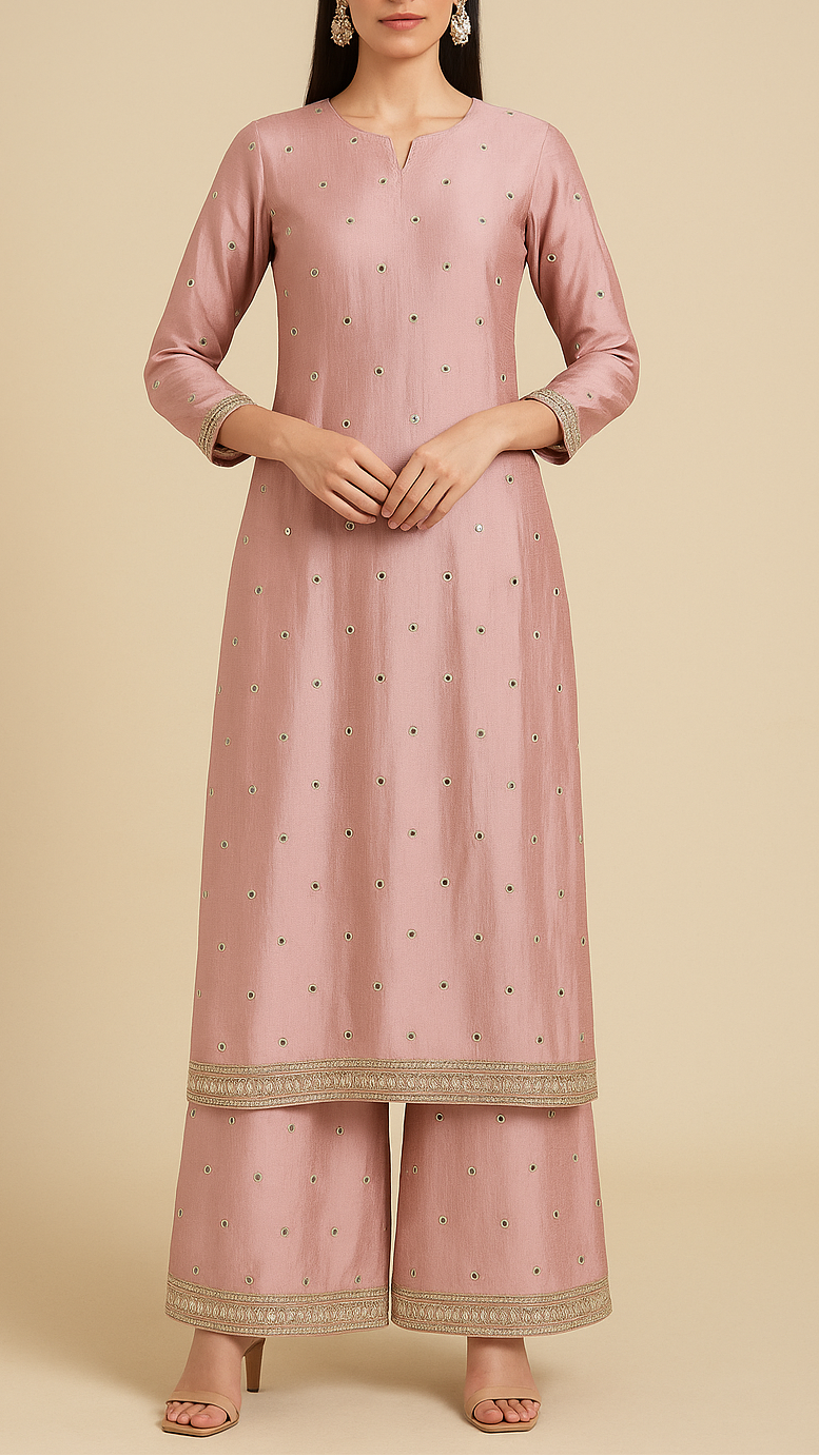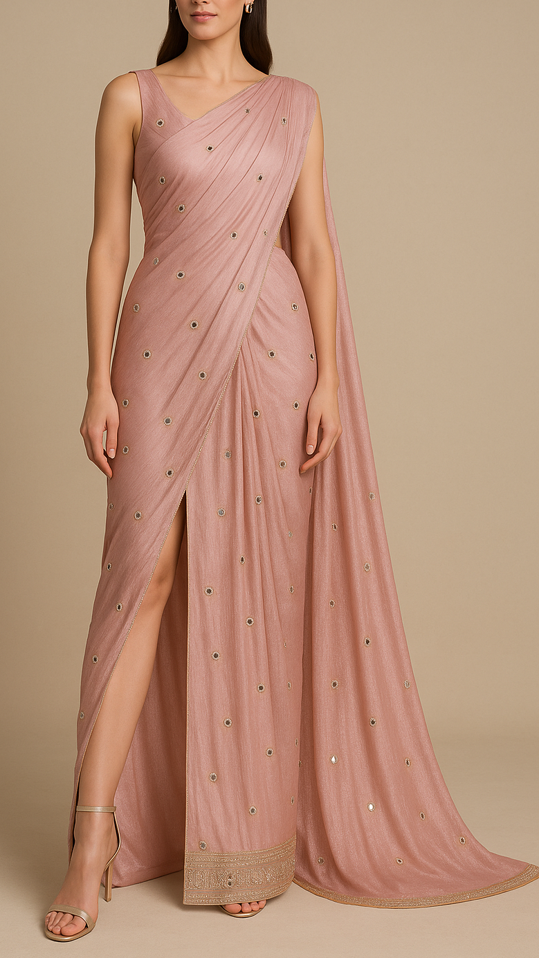 Fabric Name | Light Pink Chinon Chiffon Fabric With All Over Mirror, Zari, Katdana And Bead Work With One Side Border |