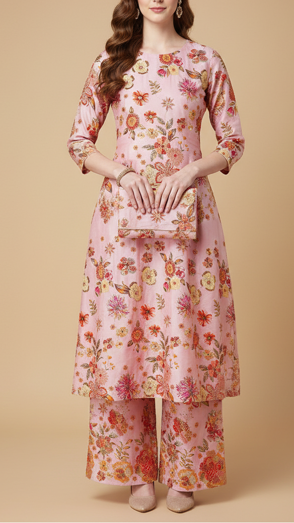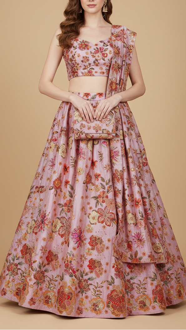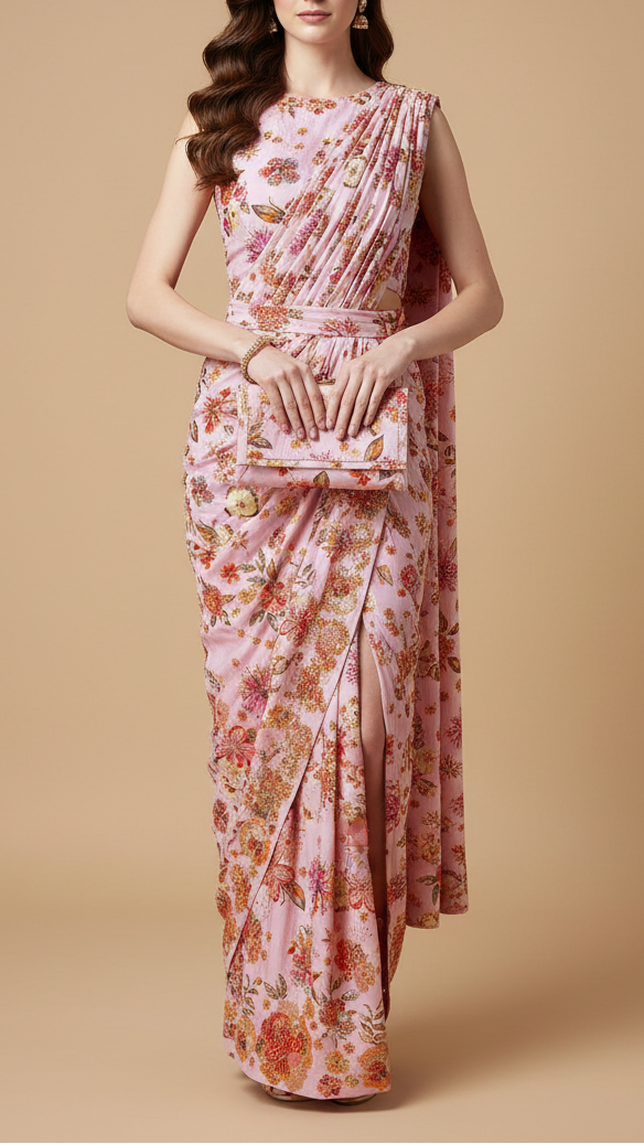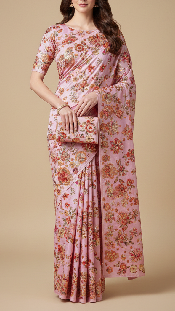 | Fabric Name | Light Pink Crepe Fabric With All Over Floral Print And Zari, Sequins Work |