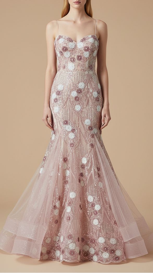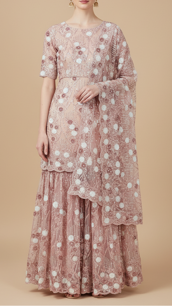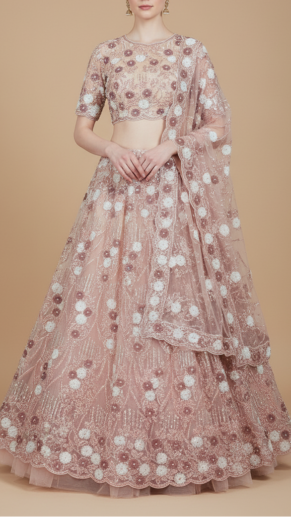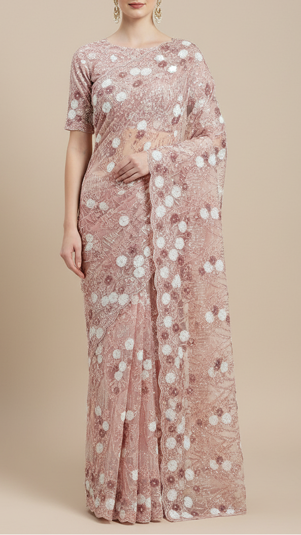 | Fabric Name | Light Pink Imported Net Fabric with Allover Ribbon Work, Katdana & Bead Work with Two-Side Scalloped Edges |