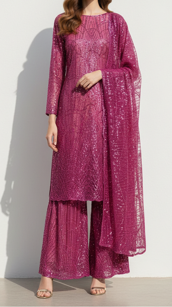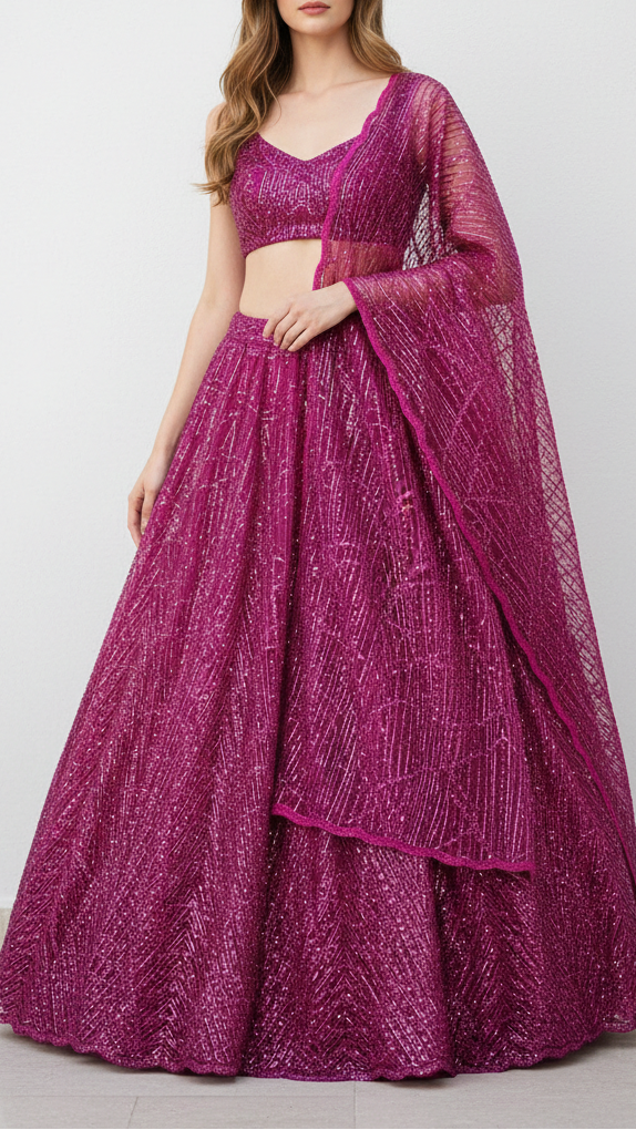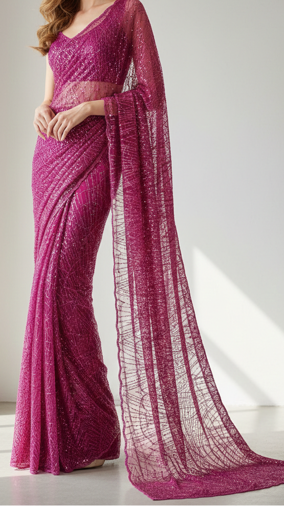 | Fabric Name | Magenta Imported Net Fabric With All Over Beads And Sequins Work With Two Side Scalloped Edges |