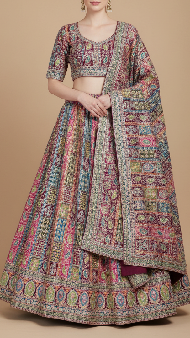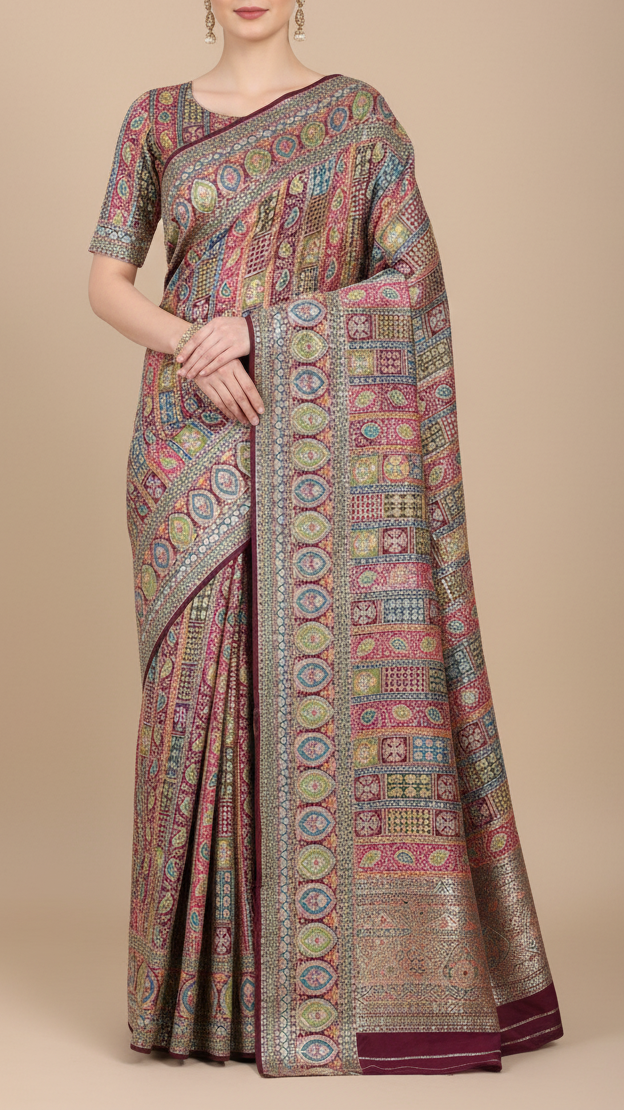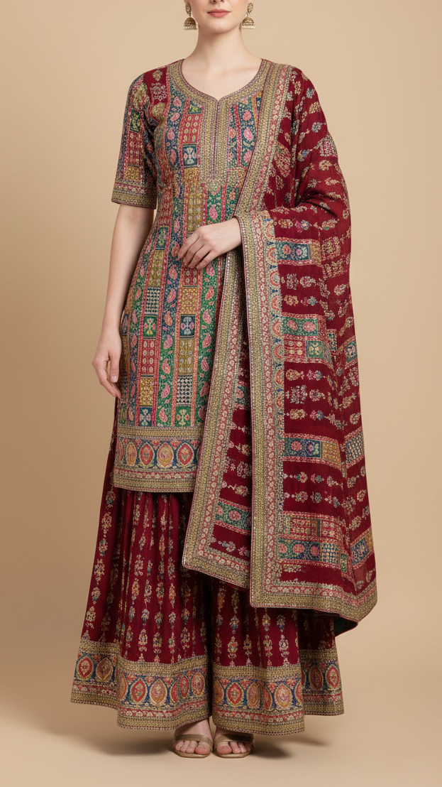 Ideal for designing sarees, dupattas, and lehengas, as well as anarkalis, kurtis, and festive gowns. The printed design with sequins and zari accents makes it perfect for wedding celebrations, festive occasions, and elegant evening wear, offering a refined, graceful, and timeless look.