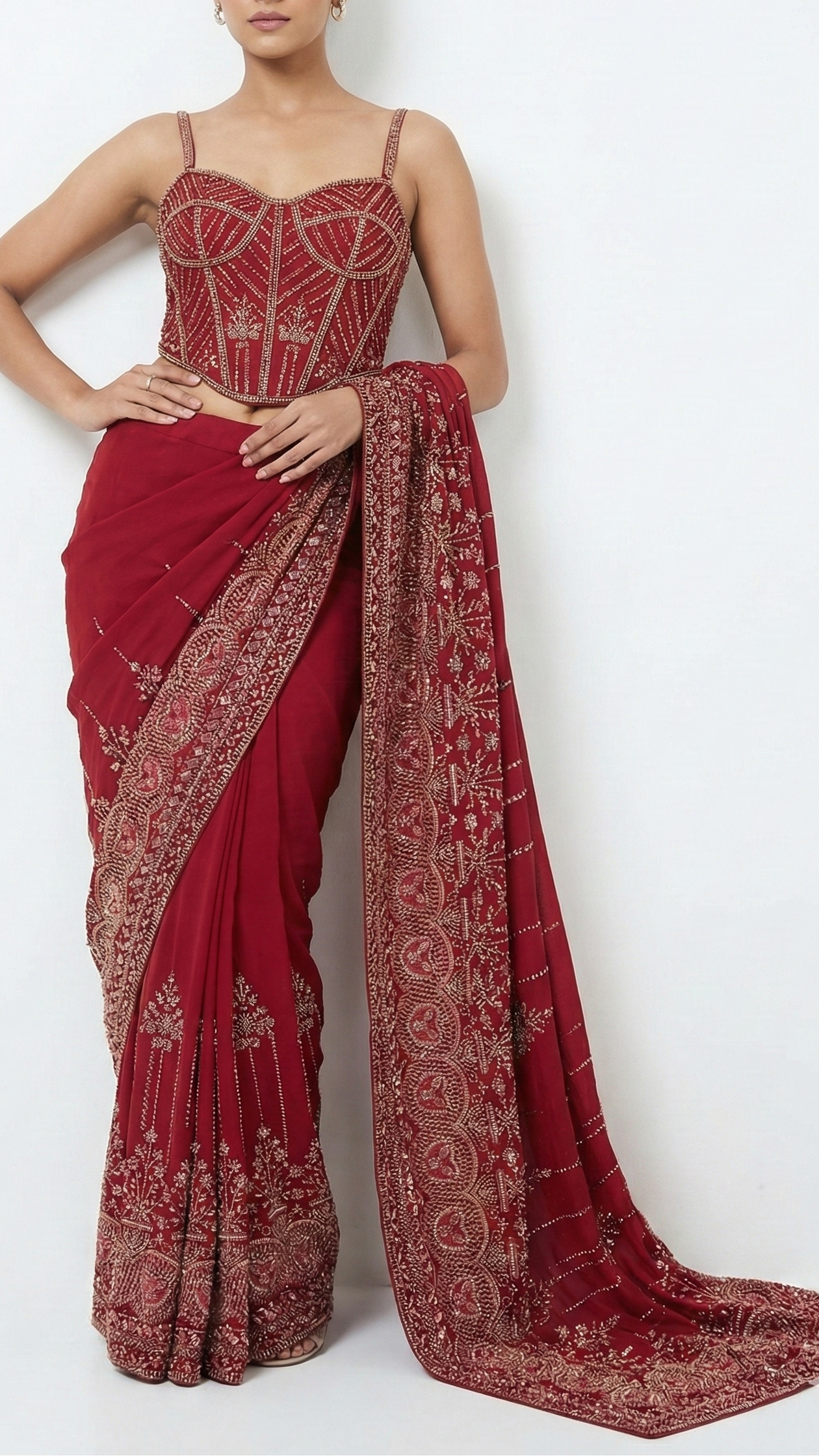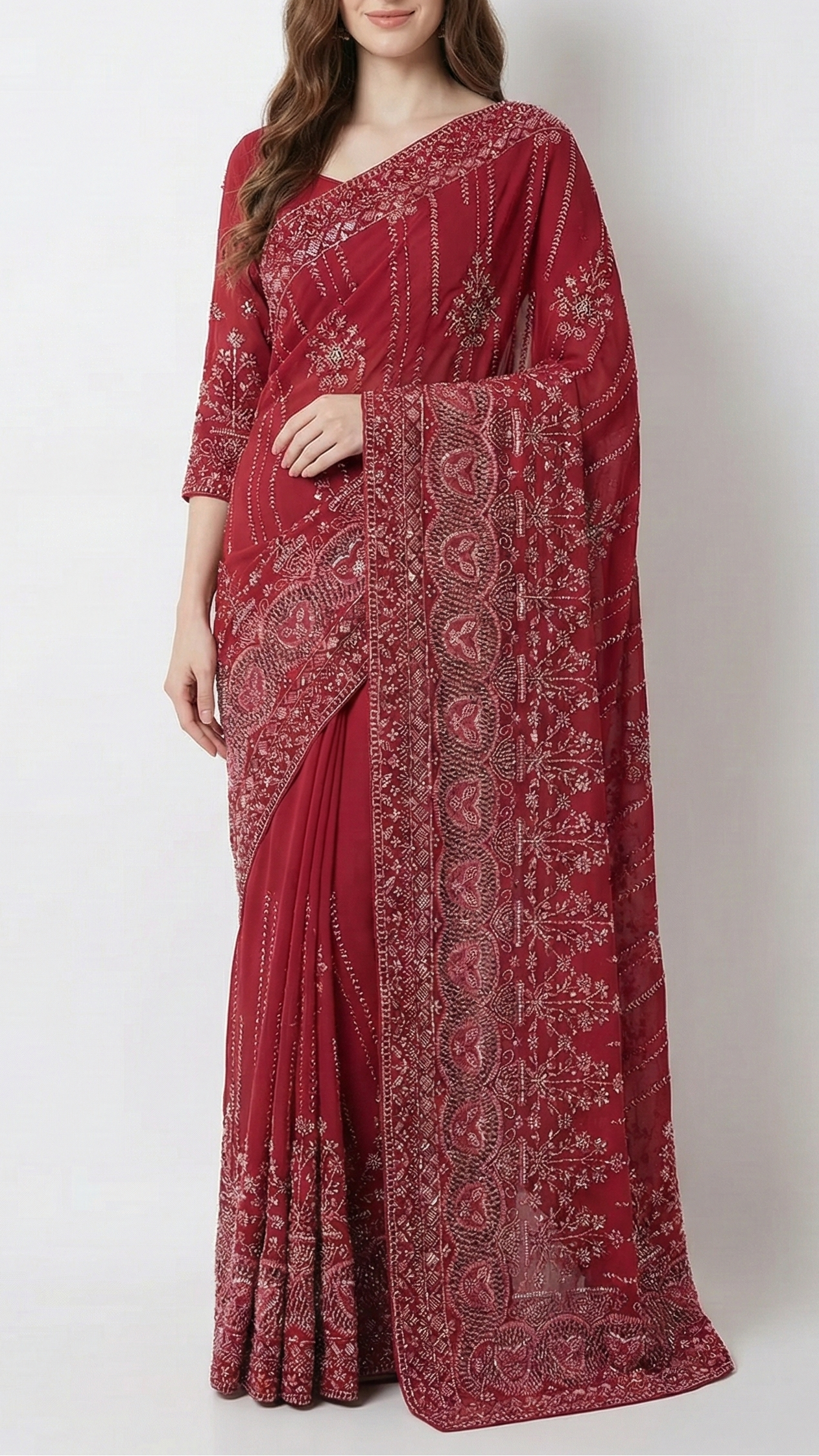 | Fabric Name | Maroon Georgette Fabric With Allover Sequins, Katdana And Bead Work With Heavy Border |