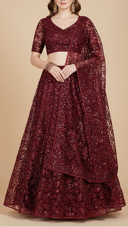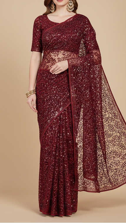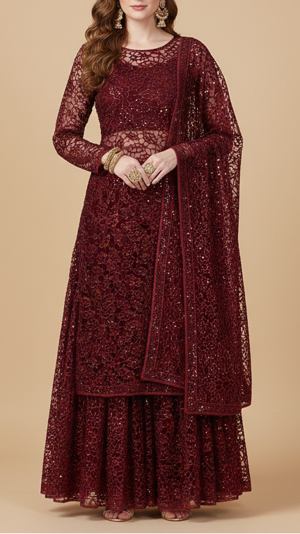 | Fabric Name | Maroon Imported Net Fabric With All Over Cutwork |