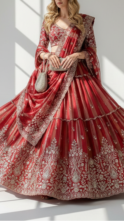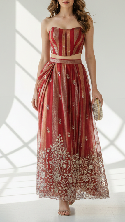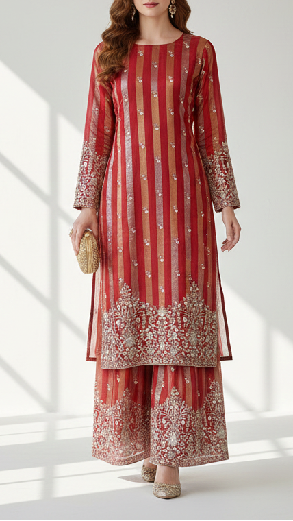 Perfect for sarees, dupattas, and layered drapes where a sophisticated striped base, subtle sparkle, and an ornate border create a graceful festive appeal.