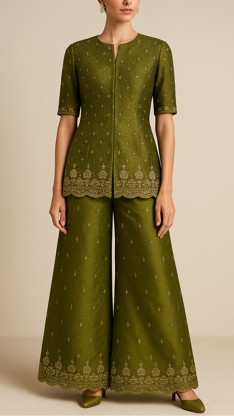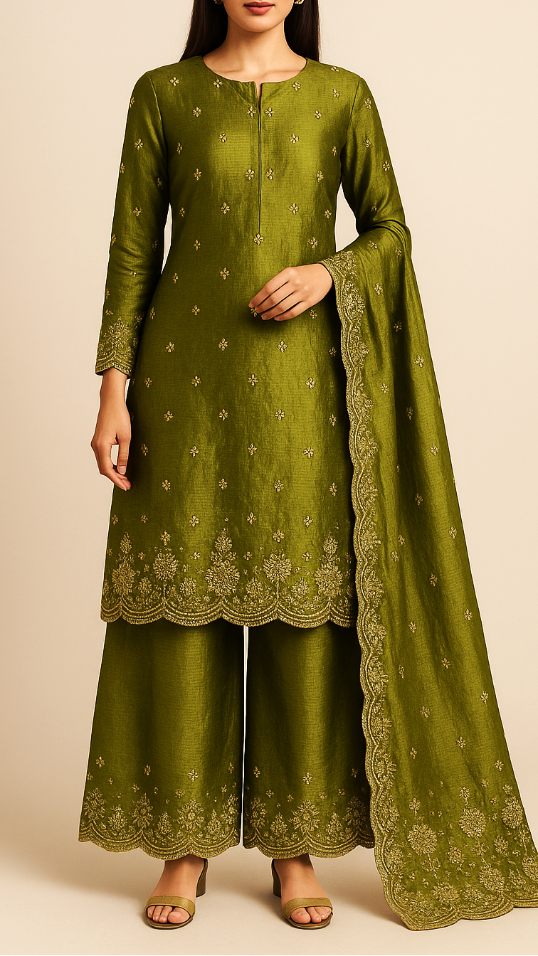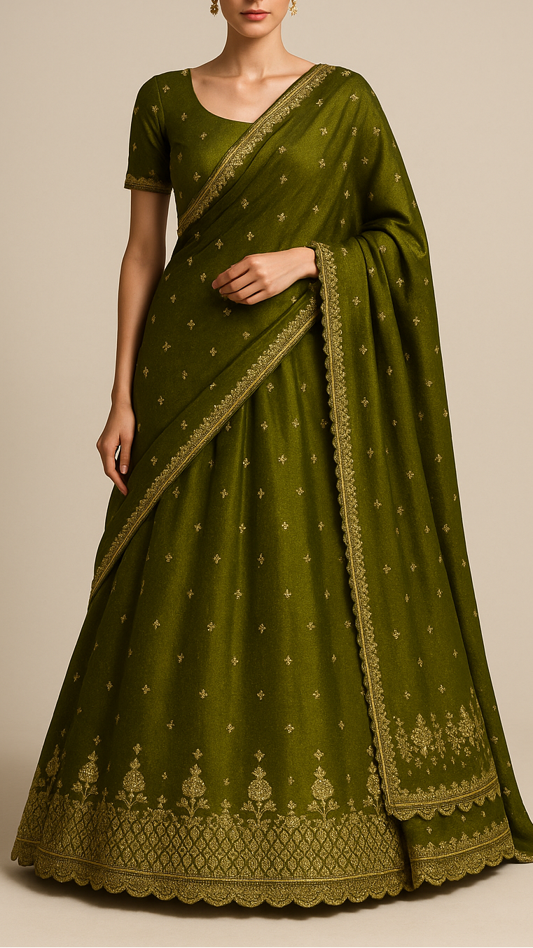 | Fabric Name | Mehendi Green Diamond Silk Fabric With All Over Zari Sequins, Katdana And Bead Work With One Side Scalloped Border |