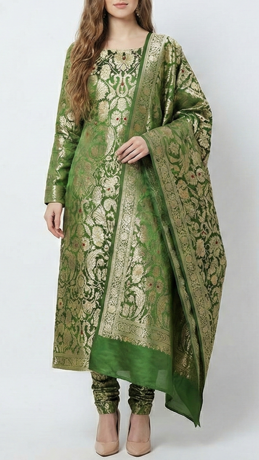 | Fabric Name | Mehendi Green Pure Banarasi Brocade Fabric With All Over Thread And Zari Handloom |