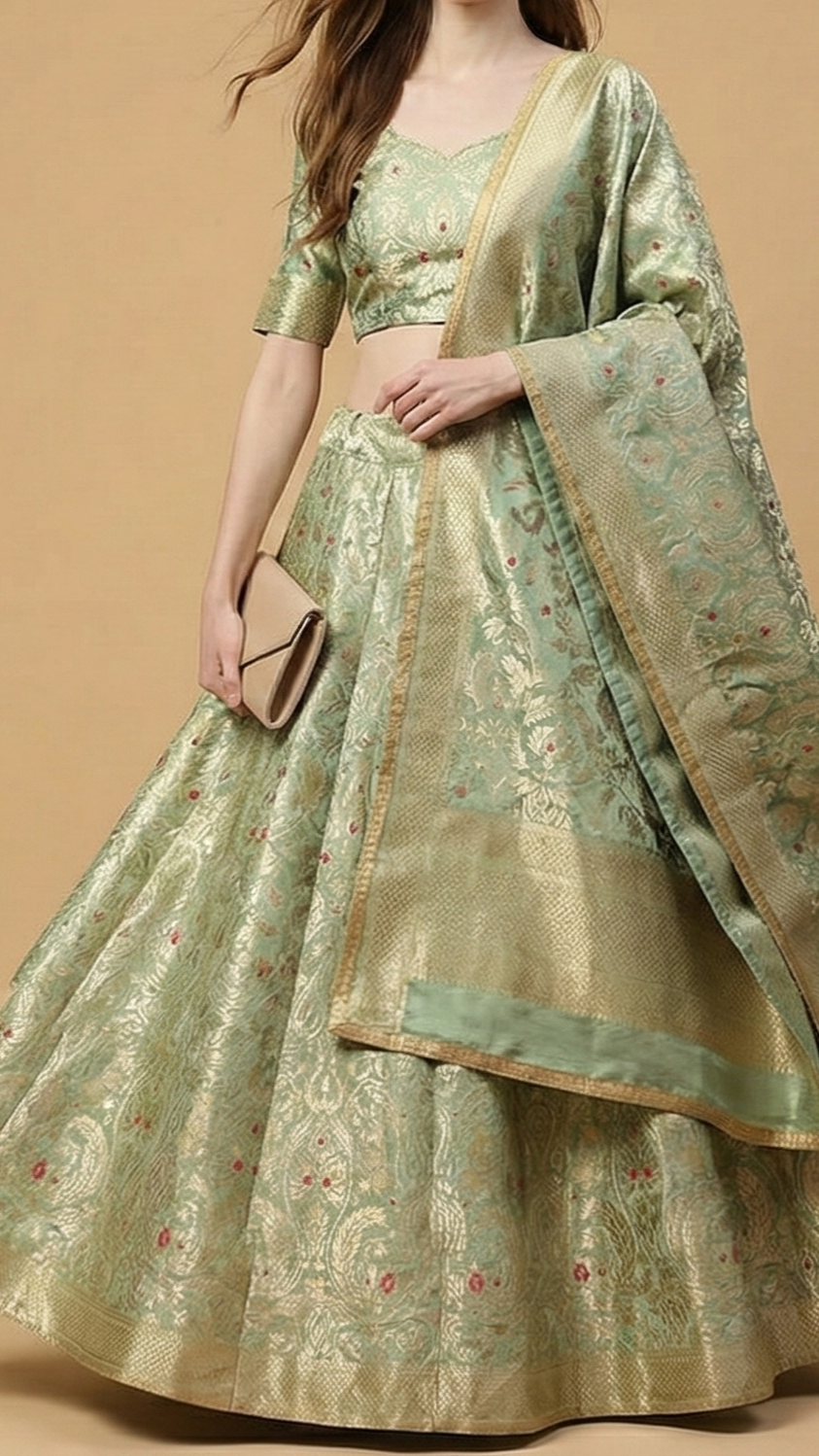 | Fabric Name | Mint Green Banarasi Brocade Fabric With All Over Zari And Thread Handloom |