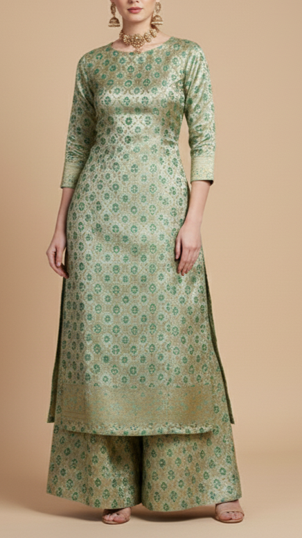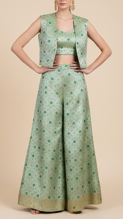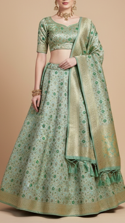 | Fabric Name | Mint Green Banarasi Brocade Fabric with Allover Golden Zari Handloom |