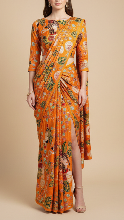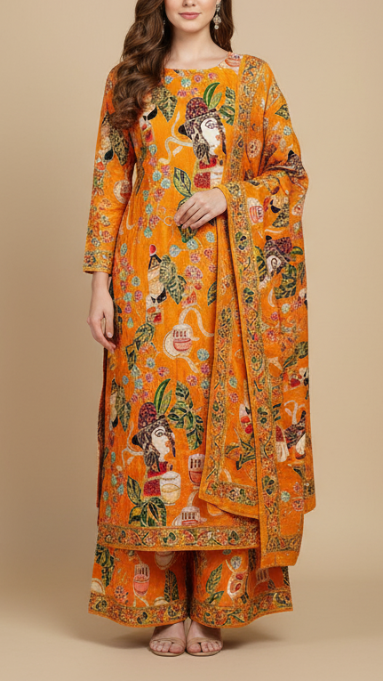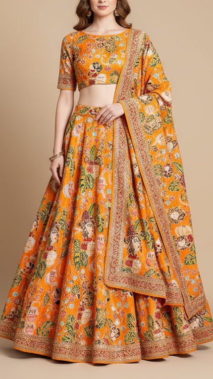 | Fabric Name | Mustard Crepe Fabric with All Over Zari and Sequins Work with Abstract Print |