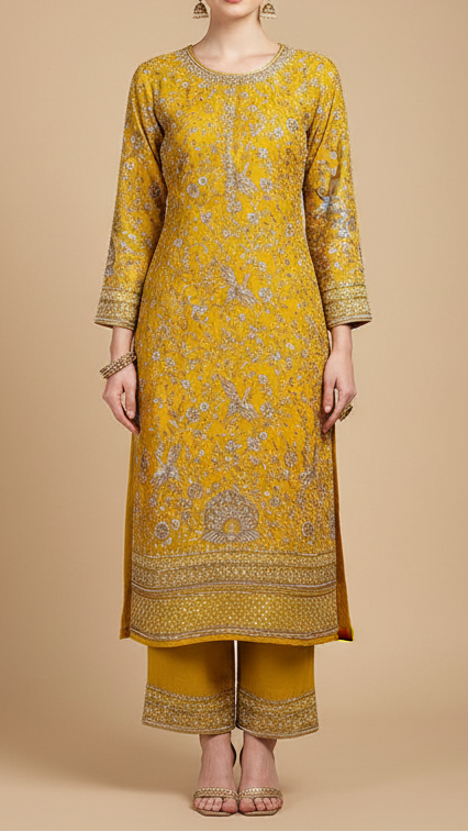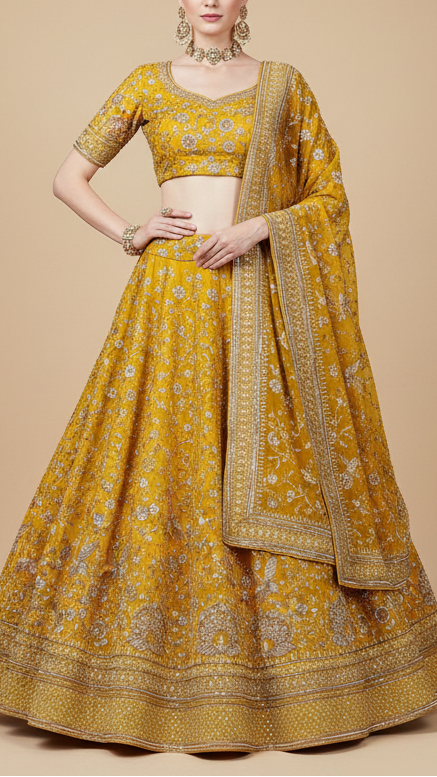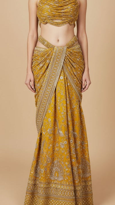 | Fabric Name | Mustard Georgette Fabric With All Over Katdana, Bead, Sequins And Zari Work With One Side Border |