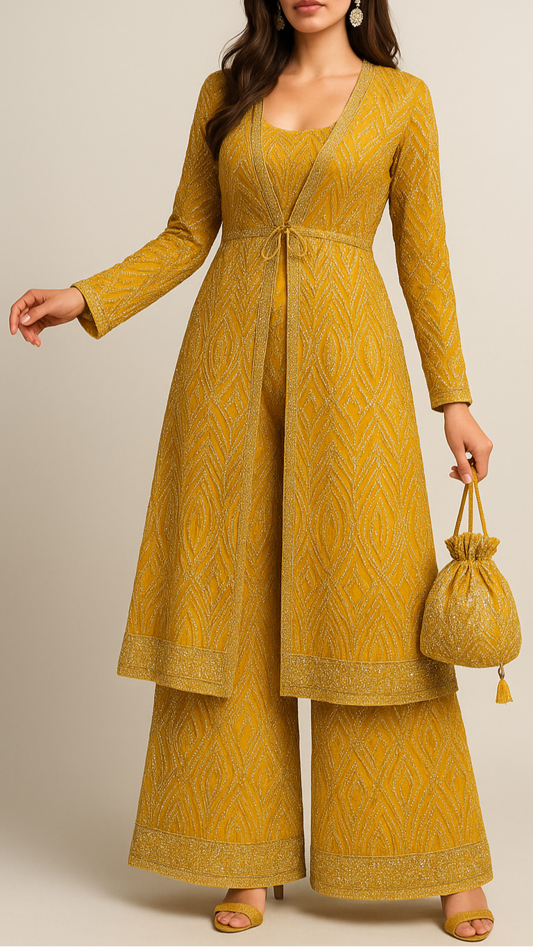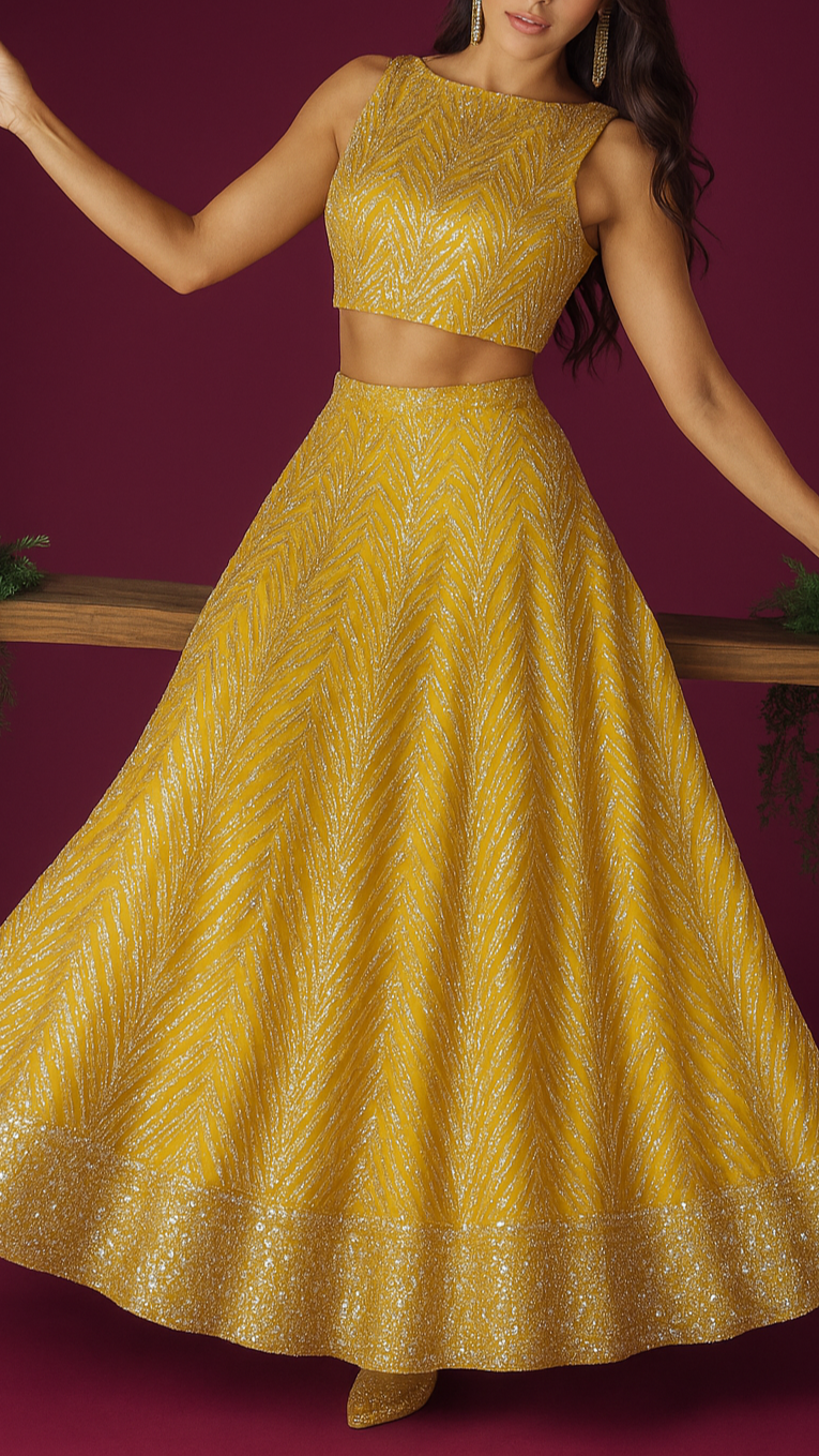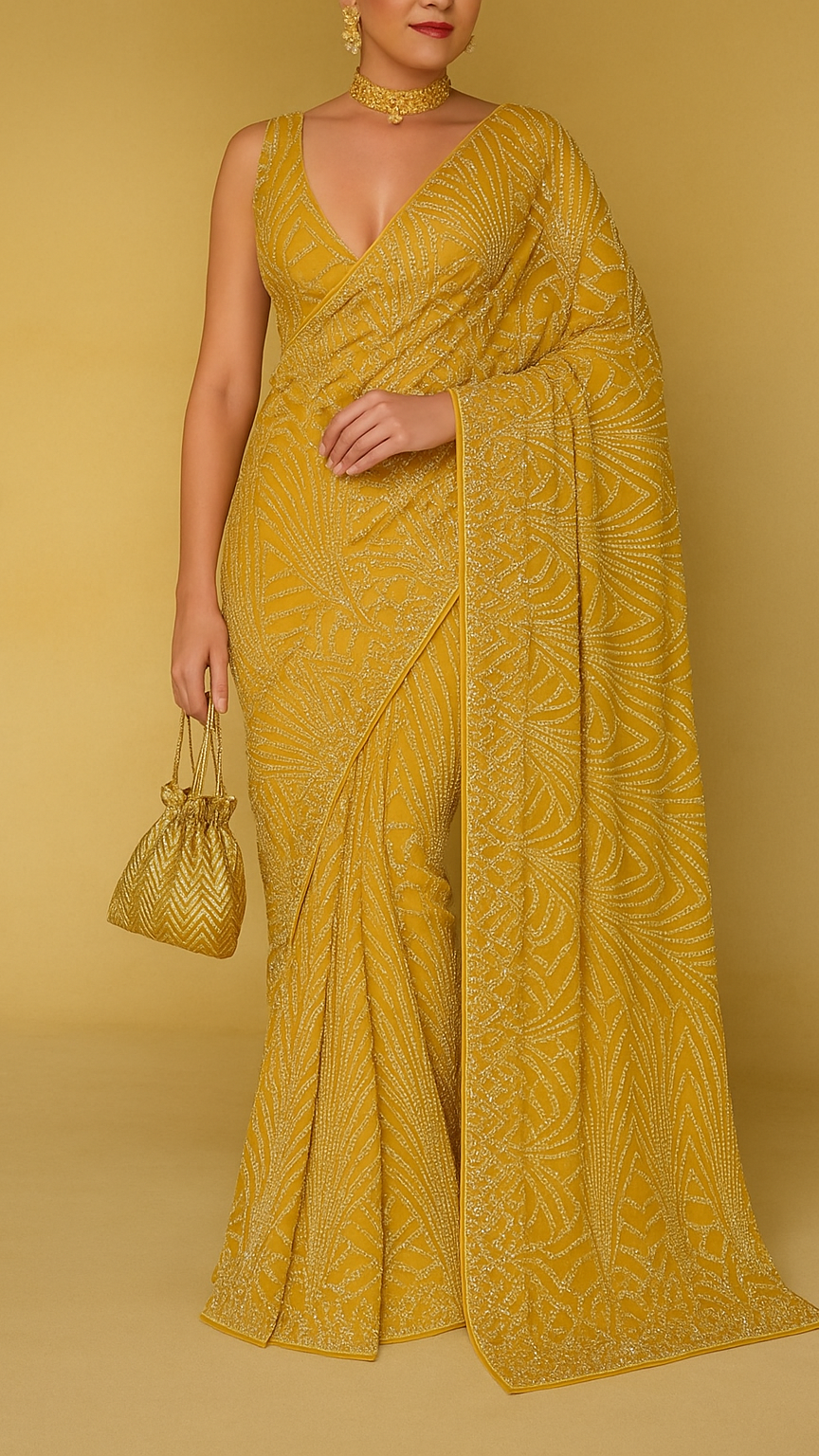 Fabric Name | Mustard Imported Net Fabric With Allover sequins, Katdana and Pearl Work With One Side Border |