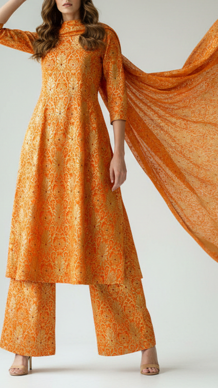 Banarasi Brocade Fabric with Allover Golden Zari Handloom is a timeless choice for creating luxurious and elegant pieces. Its rich texture and intricate zari Work make it perfect for bridal and wedding wear such as lehengas, sarees, and regal gowns. This fabric is equally suited for traditional ensembles like anarkalis, salwar suits, and sherwanis, adding a touch of grandeur to festive occasions