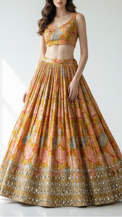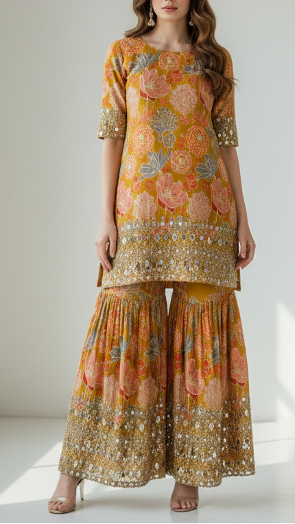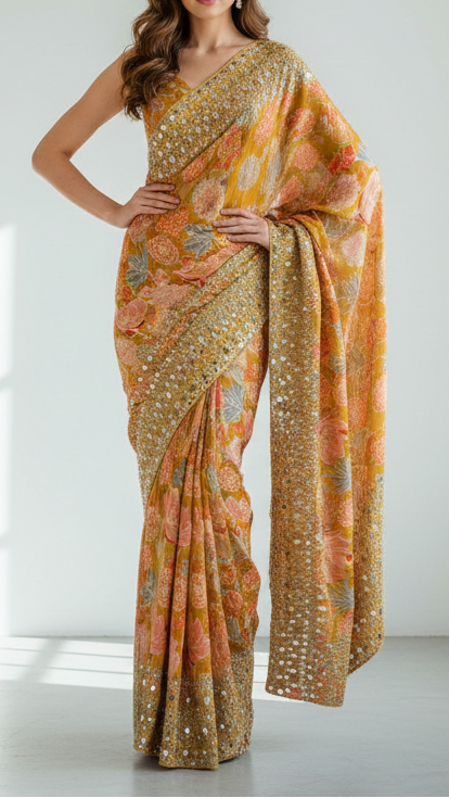 | Fabric Name | Mustard Tissue Fabric With All Over Floral Print And One Side Bead, Sequins, Zari And Faux Mirror Border |