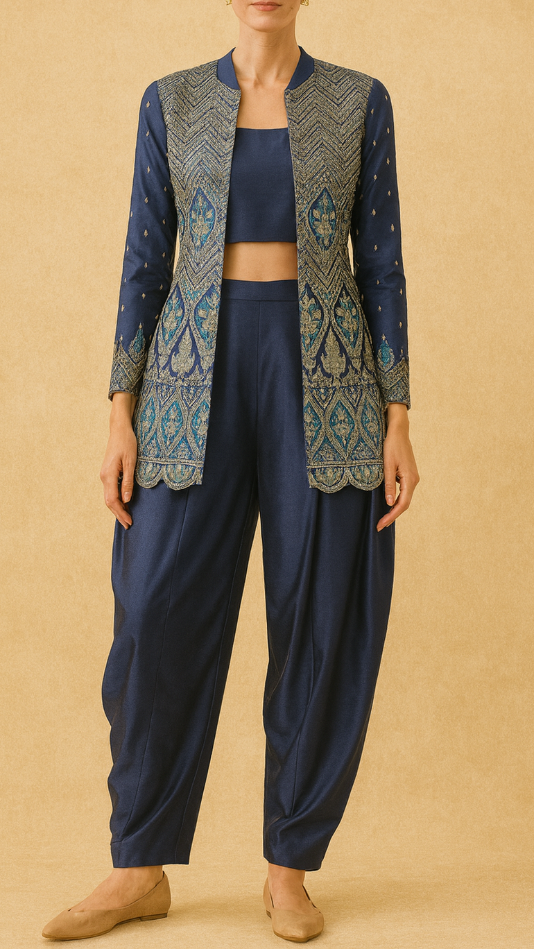 | Fabric Name | Navy Blue Crepe Printed Fabric Embellished with Zari and Sequins with One-Side Heavy Border |