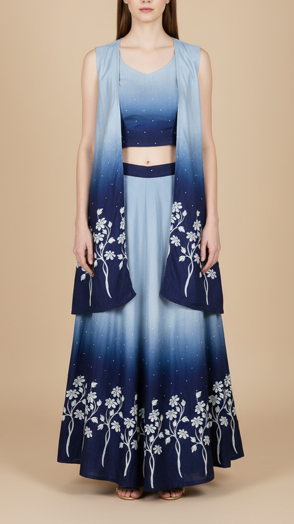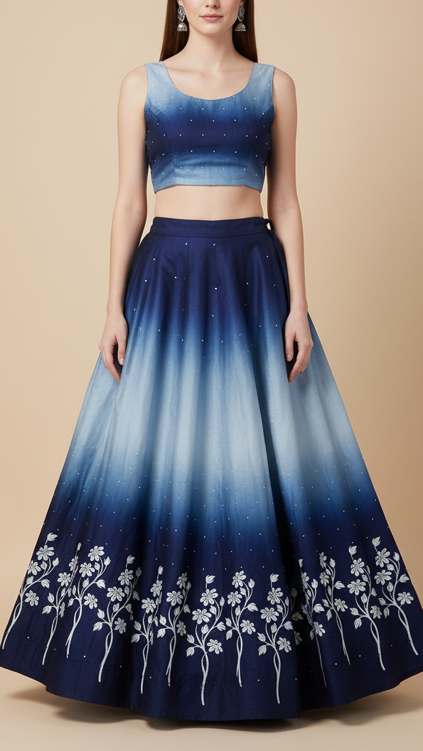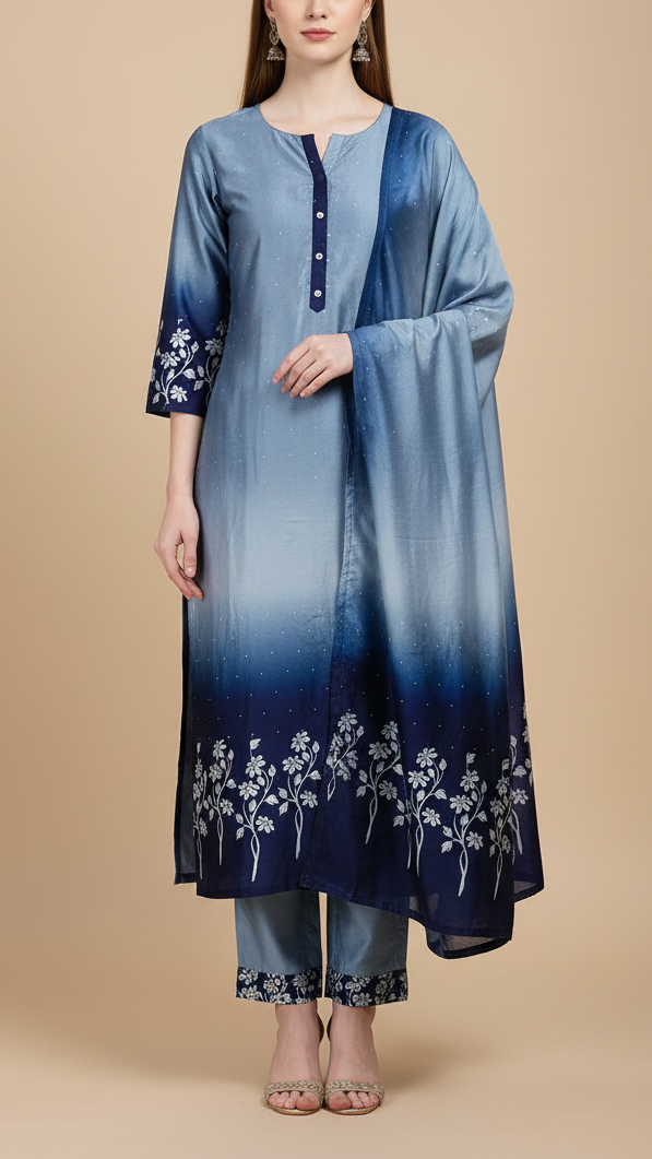 | Fabric Name | Navy Blue Dola Silk Fabric With All Over Ombre Shade And Floral Print With Bead And Sequins Work |