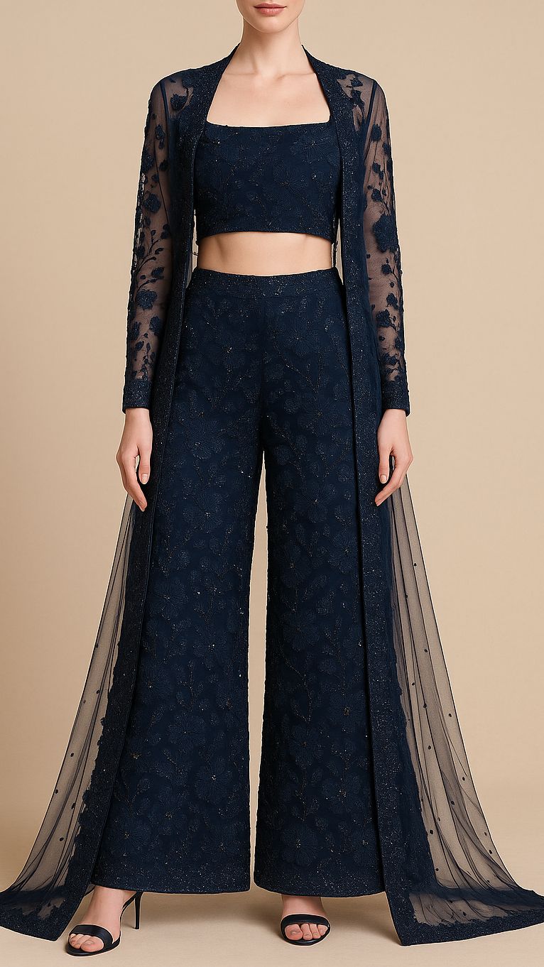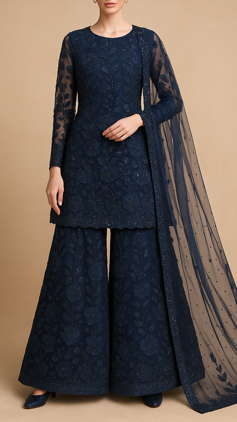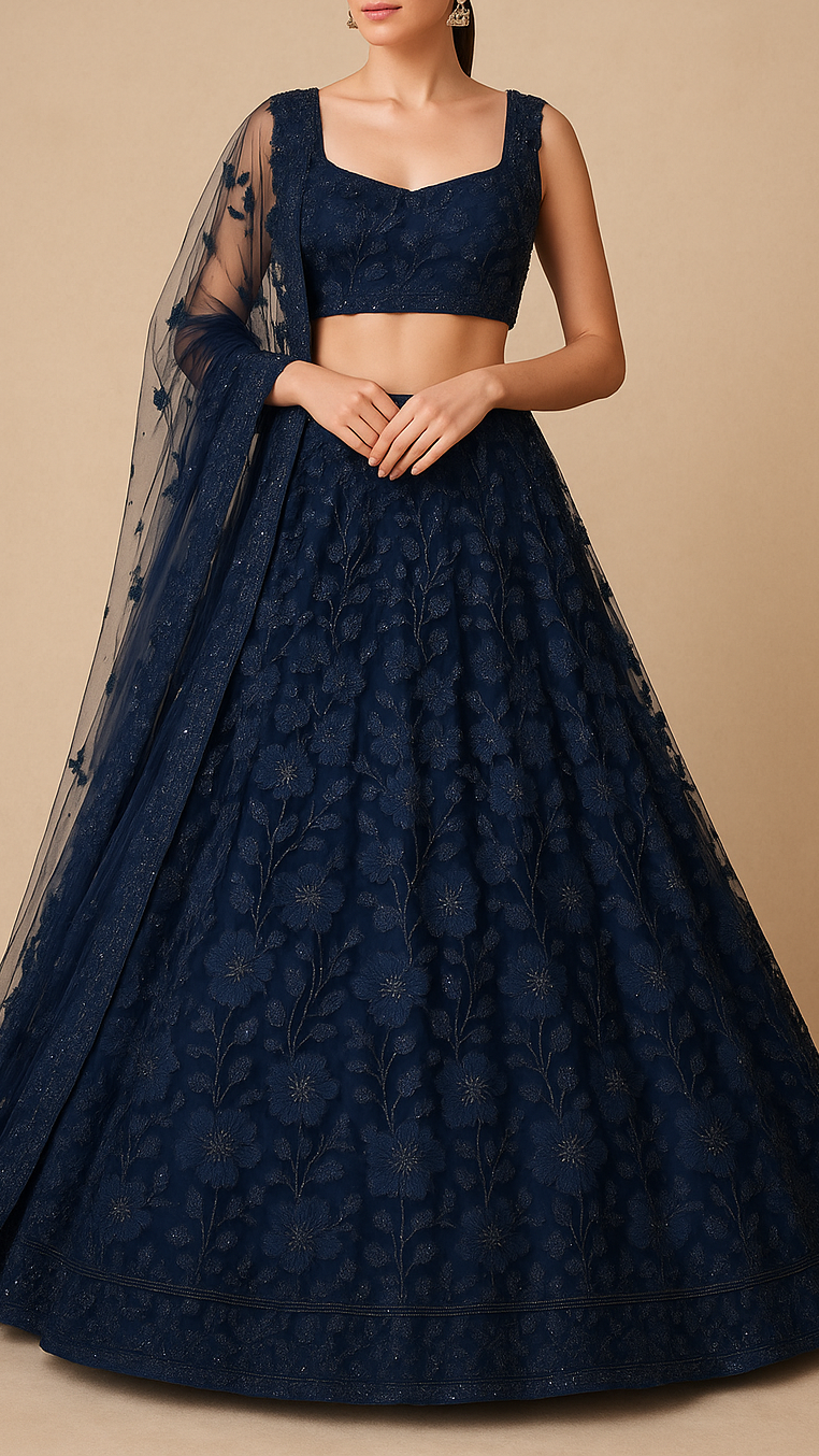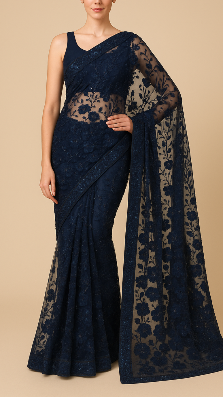 | Fabric Name | Navy Blue Imported Net Fabric With All Over Bead, Katdana And Ribbon Work |