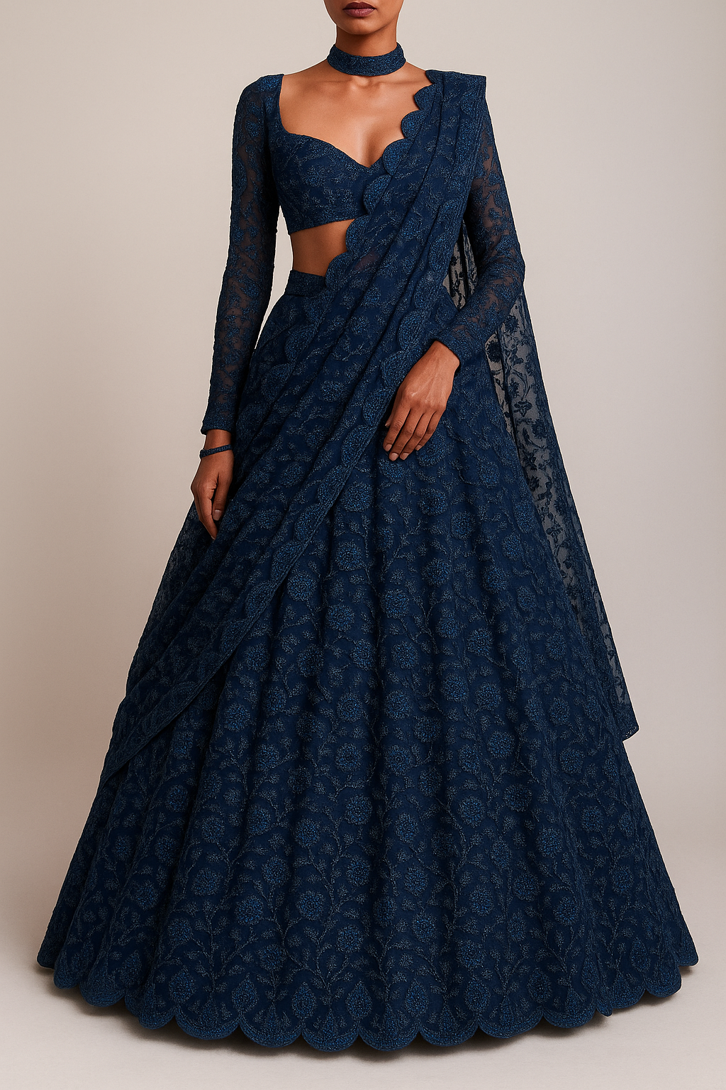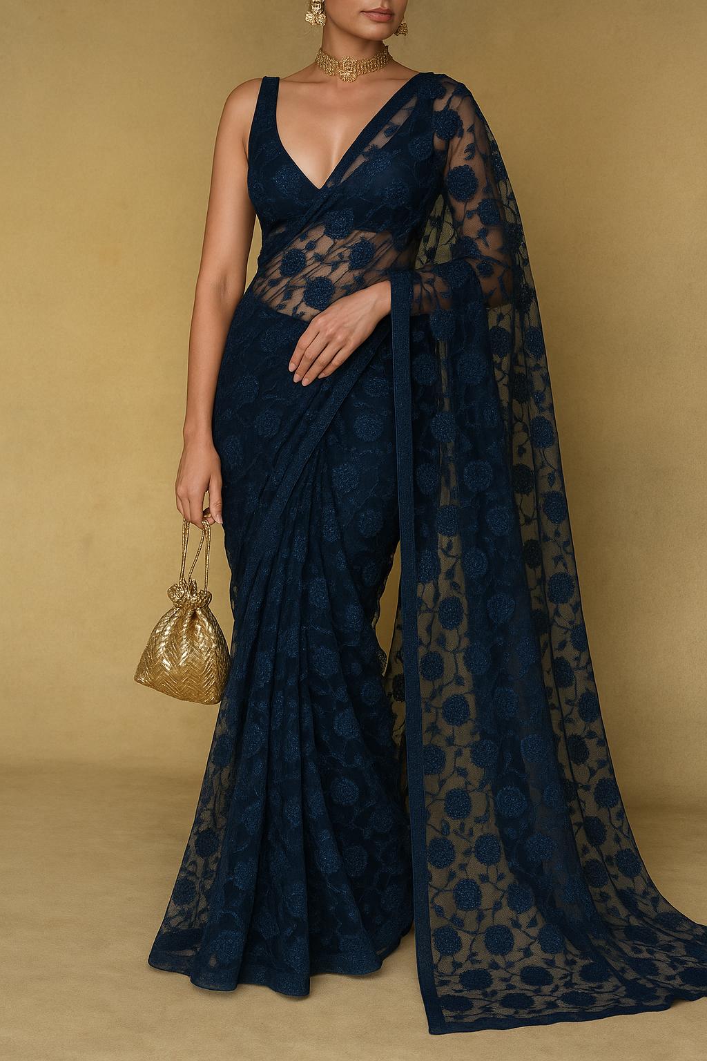 Fabric Name | Navy Blue Imported Net Fabric with Allover Bead and Sequins Work |