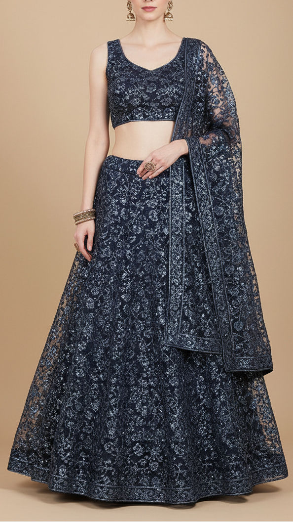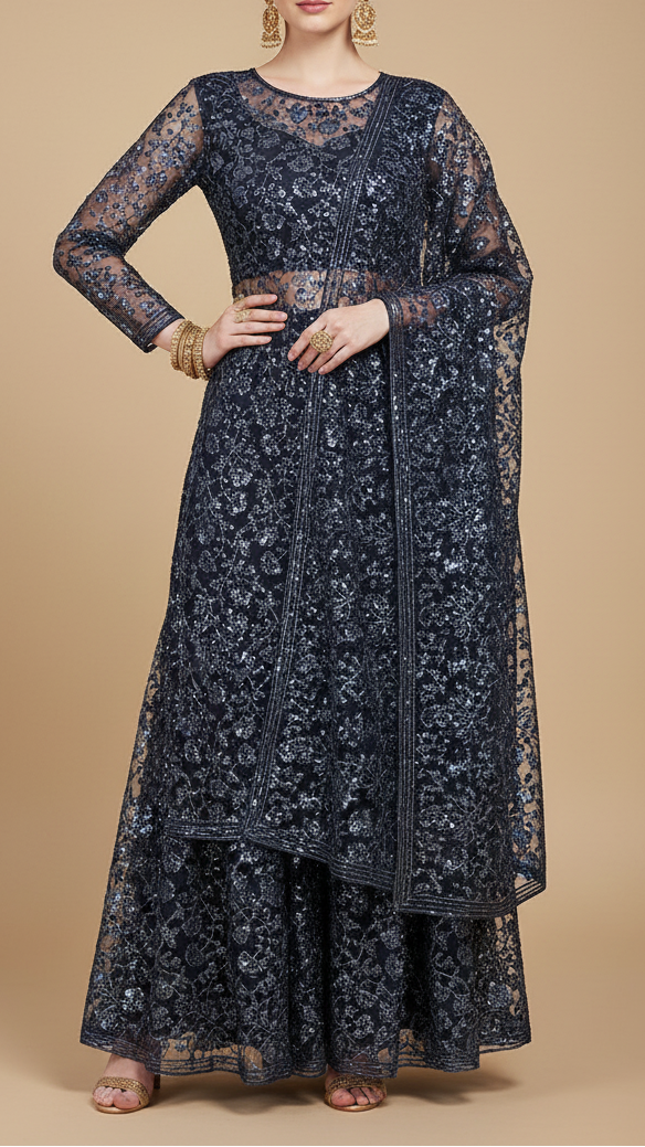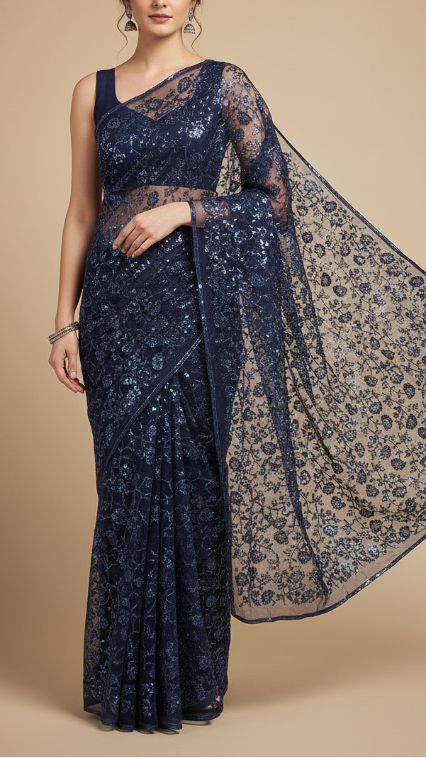 | Fabric Name | Navy Blue Imported Net Fabric with Allover Bead, Sequins and Katdana Work |